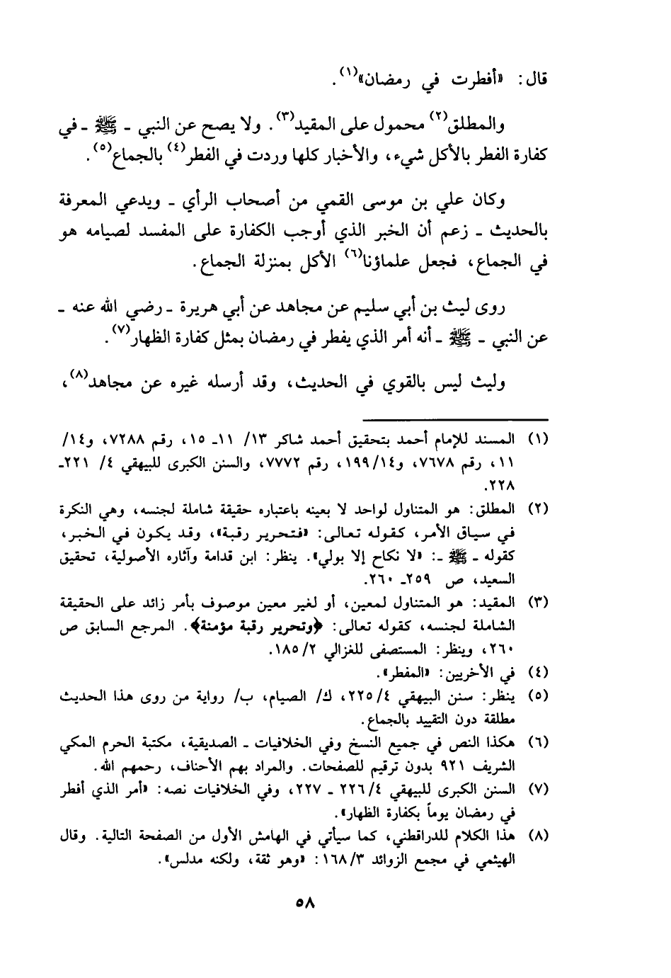 وَالْمُطلق مَحْمُول على الْمُقَيد، وَلَا يَصح عَن النَّبِي - صَلَّى اللَّهُ عَلَيْهِ وَسَلَّم َ - فِي كَفَّارَة الْفطر بِالْأَكْلِ شَيْء، وَالْأَخْبَار كلهَا وَردت فِي الْفطر بِالْجِمَاعِ.