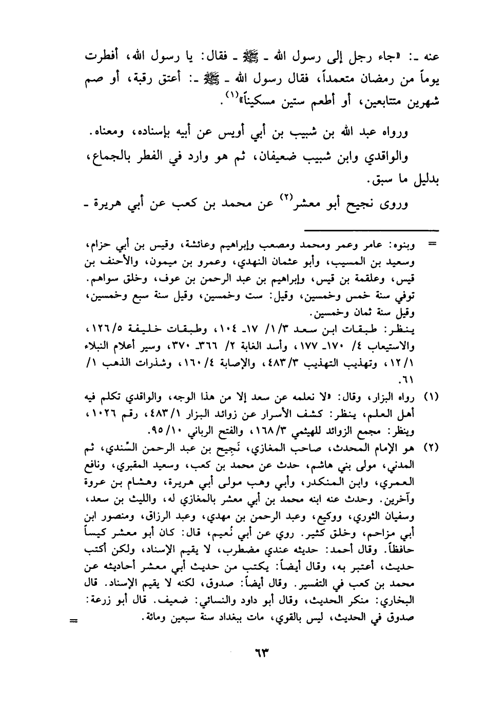 وَرَوَاهُ عبد الله بن شبيب بن أبي أويس عَن أَبِيه بِإِسْنَادِهِ، وَمَعْنَاهُ. والواقدي وَابْن شبيب ضعيفان، ثمَّ هُوَ وَارِد فِي الْفطر بِالْجِمَاعِ، بِدَلِيل مَا سبق.