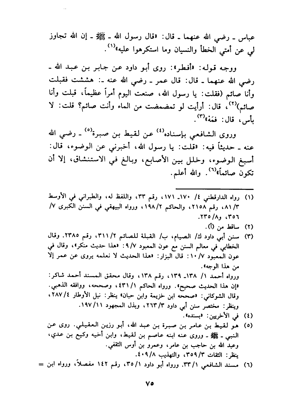 وروى الشَّافِعِي بِإِسْنَادِهِ عَن لَقِيط بن صبرَة - رَضِي الله عَنهُ - حَدِيثا فِيهِ: " قلت: يَا رَسُول الله، أَخْبرنِي عَن الْوضُوء، قَالَ: أَسْبغ الْوضُوء، وخلل بَين الْأَصَابِع، وَبَالغ فِي الِاسْتِنْشَاق، إِلَّا أَن تكون صَائِما ". وَالله أعلم.