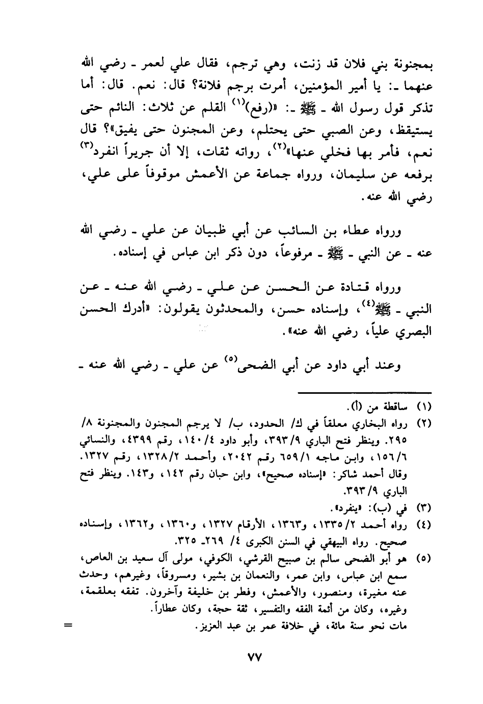 بمجنونة بني فلَان قد زنت، وَهِي ترْجم، فَقَالَ عَليّ لعمر - رَضِي الله عَنْهُمَا -: يَا أَمِير الْمُؤمنِينَ، أمرت برجم فُلَانَة؟ قَالَ: نعم. قَالَ: أما تذكر قَول رَسُول الله - صَلَّى اللَّهُ عَلَيْهِ وَسَلَّم َ -: " (رفع) الْقَلَم عَن ثَلَاث: النَّائِم حَتَّى يَسْتَيْقِظ، وَعَن الصَّبِي حَنى يَحْتَلِم، وَعَن الْمَجْنُون حَتَّى يفِيق "؟ قَالَ نعم، فَأمر بهَا فخلى عَنْهَا "، رُوَاته ثِقَات، إِلَّا أَن جَرِيرًا انْفَرد بِرَفْعِهِ عَن سُلَيْمَان، وَرَوَاهُ جمَاعَة عَن الْأَعْمَش مَوْقُوفا على عَليّ، رَضِي الله عَنهُ.