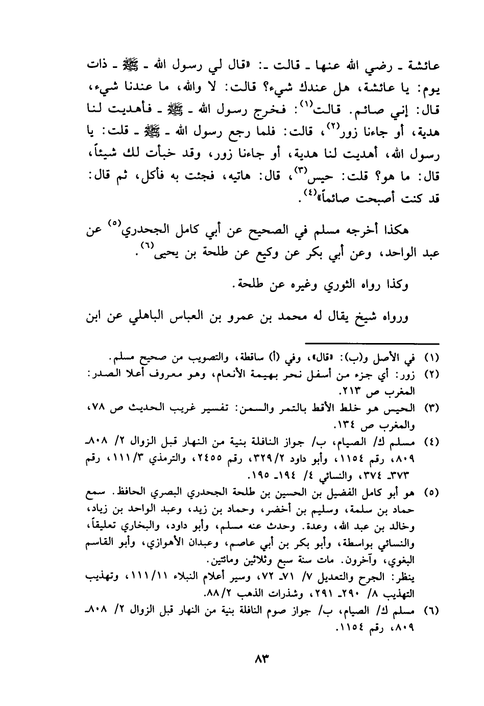 عَائِشَة - رَضِي الله عَنْهَا - قَالَت -: " قَالَ لي رَسُول الله - صَلَّى اللَّهُ عَلَيْهِ وَسَلَّم َ - ذَات يَوْم: يَا عَائِشَة، هَل عنْدك شَيْء؟ قَالَت: لَا وَالله، مَا عندنَا شَيْء، قَالَ: إِنِّي صَائِم. قَالَت: فَخرج رَسُول الله - صَلَّى اللَّهُ عَلَيْهِ وَسَلَّم َ - فأهديت لنا هَدِيَّة، أَو جَاءَنَا زور، قَالَت: فَلَمَّا رَجَعَ رَسُول الله - صَلَّى اللَّهُ عَلَيْهِ وَسَلَّم َ - قلت: يَا رَسُول الله أهديت لنا هَدِيَّة، أَو جَاءَنَا زور، وَقد خبأت لَك شَيْئا، قَالَ: مَا هُوَ؟ قلت: حيس، قَالَ: هاتيه، فَجئْت بِهِ فَأكل، ثمَّ قَالَ: قد كنت أَصبَحت صَائِما ".