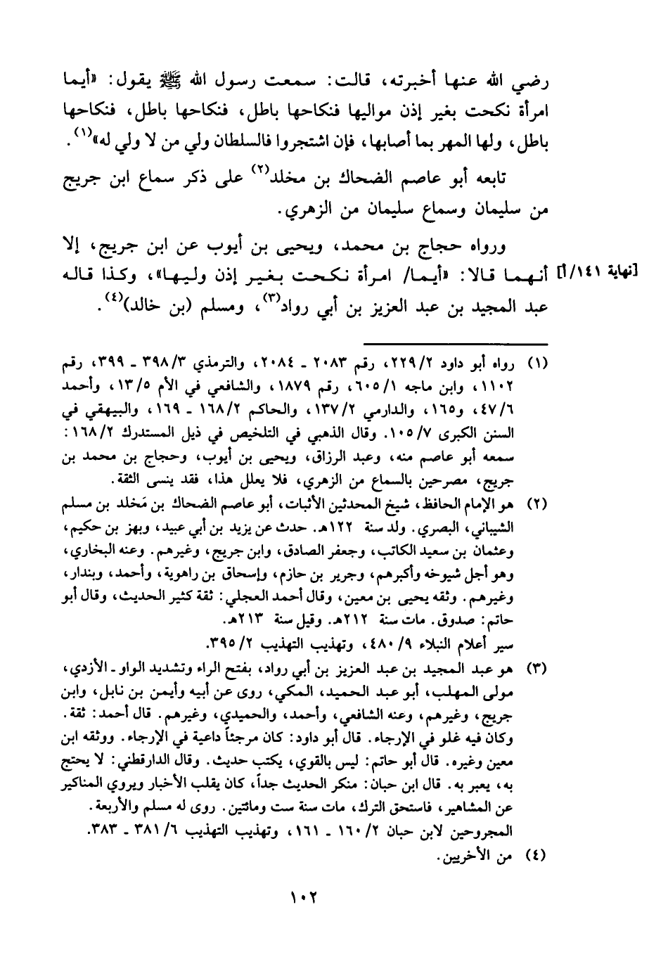 وَرَوَاهُ حجاج بن مُحَمَّد، وَيحيى بن أَيُّوب عَن ابْن جريج، إِلَّا انهما قَالَا: " أَيّمَا / امْرَأَة نكحت بِغَيْر إِذن وَليهَا "، وَكَذَا قَالَه عبد الْمجِيد بن عبد الْعَزِيز بن أبي رواد، وَمُسلم (بن خَالِد) .