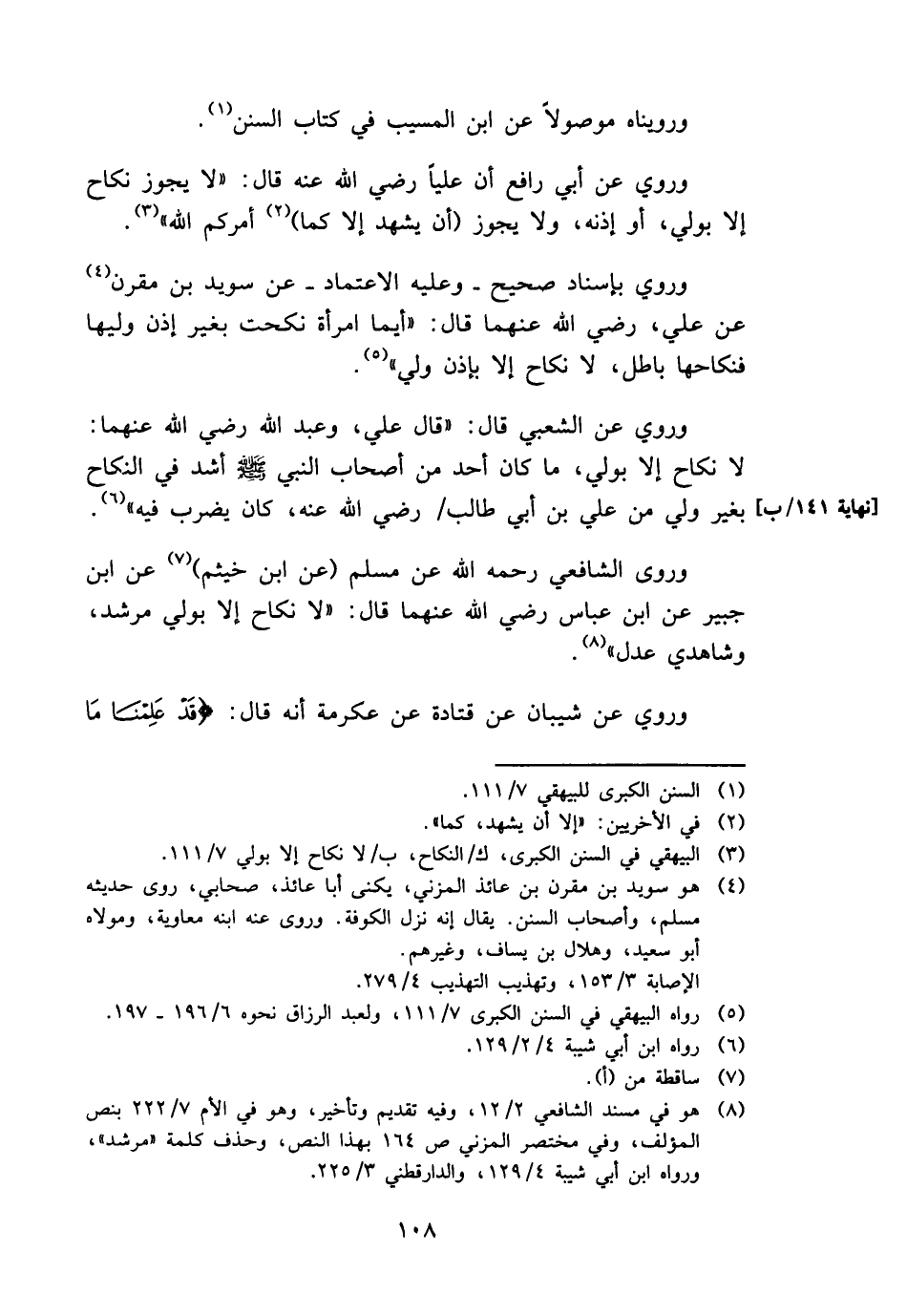 وَرُوِيَ بِإِسْنَاد صَحِيح - وَعَلِيهِ الِاعْتِمَاد - عَن سُوَيْد بن مقرن عَن عَليّ، رَضِي الله عَنْهُمَا قَالَ: " أَيّمَا امْرَأَة نكحت بِغَيْر إِذن وَليهَا فنكاحها بَاطِل، لَا نِكَاح إِلَّا بِإِذن ولي ".