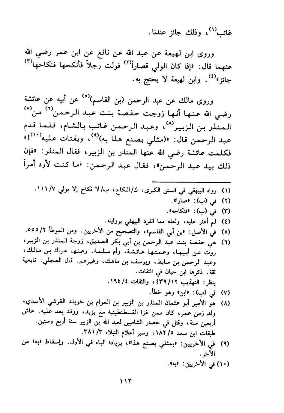 وَرُوِيَ مَالك عَن عبد الرَّحْمَن (بن الْقَاسِم) عَن أَبِيه عَن عَائِشَة رَضِي الله عَنْهَا أَنَّهَا زوجت حَفْصَة بنت عبد الرَّحْمَن من الْمُنْذر بن الزبير، وَعبد الرَّحْمَن غَائِب بِالشَّام، فَلَمَّا قدم عبد الرَّحْمَن قَالَ: " (مثلي يصنع هَذَا بِهِ) ، ويفتات عَلَيْهِ! " فكلمت عَائِشَة رَضِي الله عَنْهَا الْمُنْذر بن الزبير، فَقَالَ الْمُنْذر: " فَإِن ذَلِك بيد عبد الرَّحْمَن "، فَقَالَ عبد الرَّحْمَن: " مَا كنت لأرد أمرا