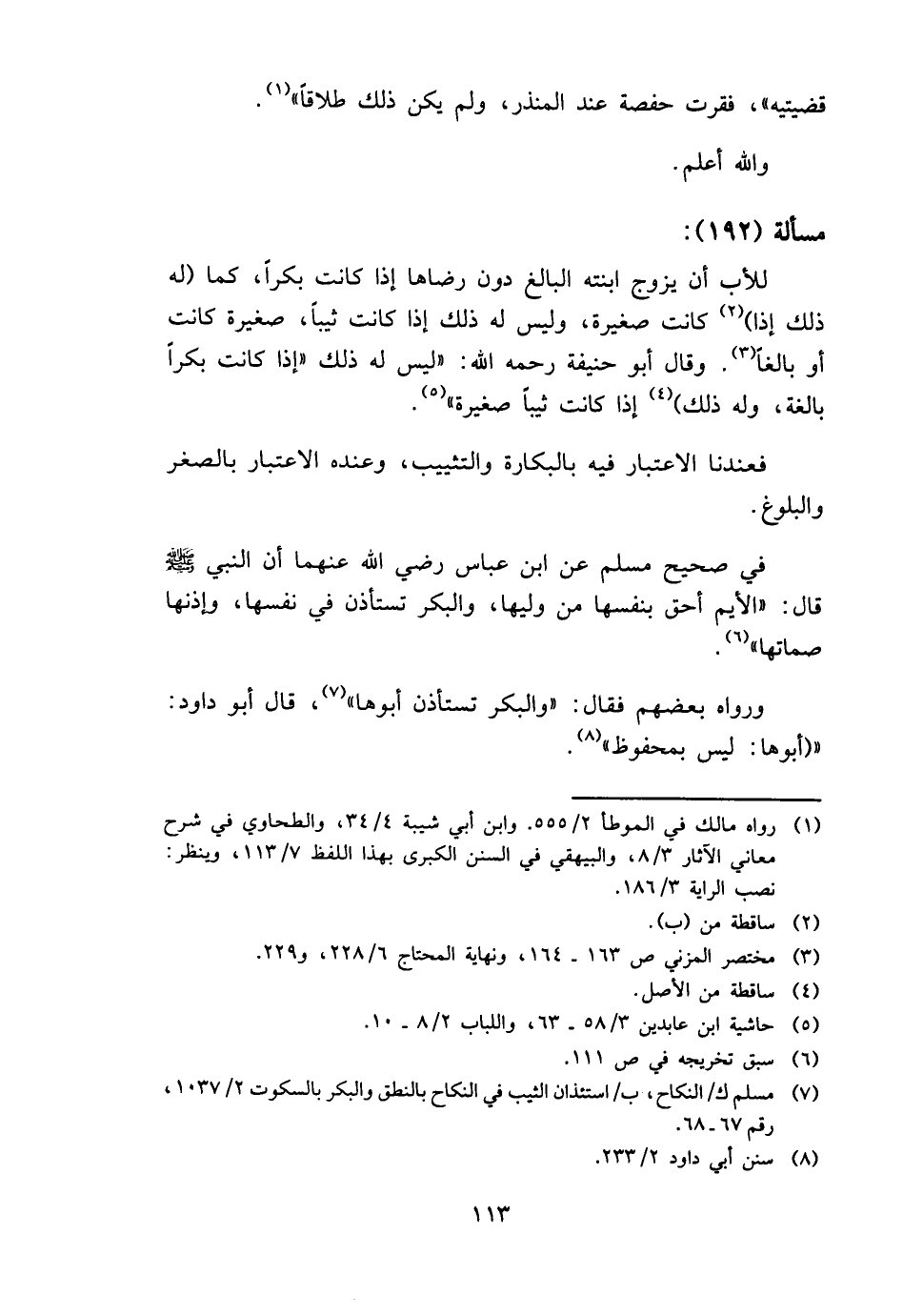 للْأَب ان يُزَوّج ابْنَته الْبَالِغ دون رِضَاهَا إِذا كَانَت بكرا، كَمَا (لَهُ ذَلِك إِذا) كَانَت صَغِيرَة، وَلَيْسَ لَهُ ذَلِك إِذا كَانَت ثَيِّبًا، صَغِيرَة كَانَت أَو بَالغا. وَقَالَ أَبُو حنيفَة رَحمَه الله: " لَيْسَ لَهُ ذَلِك " بَالِغَة، وَله ذَلِك " إِذا كَانَت بكرا إِذا كَانَت ثَيِّبًا صَغِيرَة ".