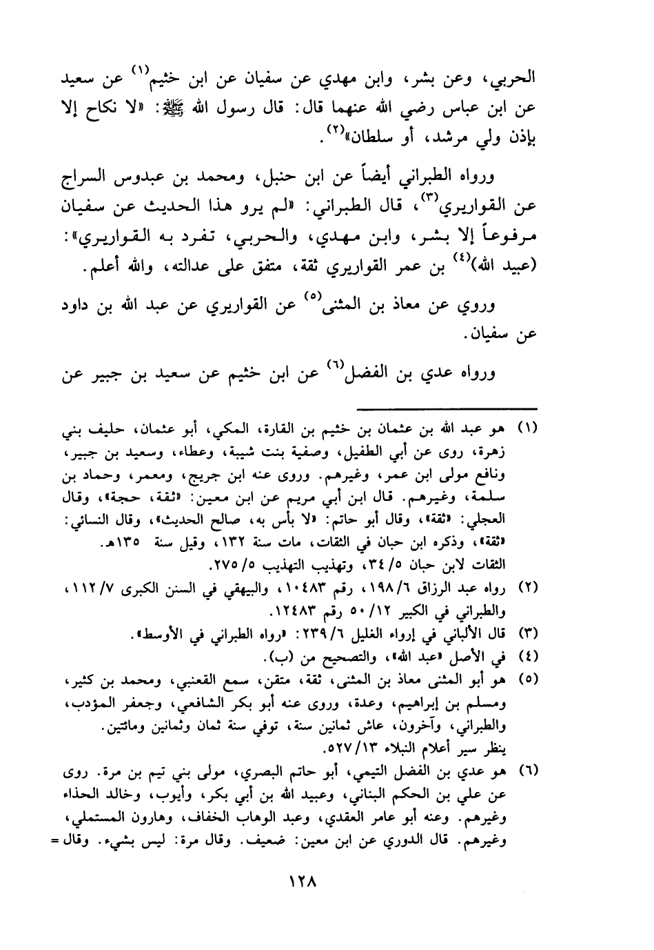 الْحَرْبِيّ، وَعَن بشر، وَابْن مهْدي عَن سُفْيَان عَن ابْن خثيم عَن سعيد عَن ابْن عَبَّاس رَضِي الله عَنْهُمَا قَالَ: قَالَ رَسُول الله - صَلَّى اللَّهُ عَلَيْهِ وَسَلَّم َ -: " لَا نِكَاح إِلَّا بِإِذن ولي مرشد، أَو سُلْطَان ".