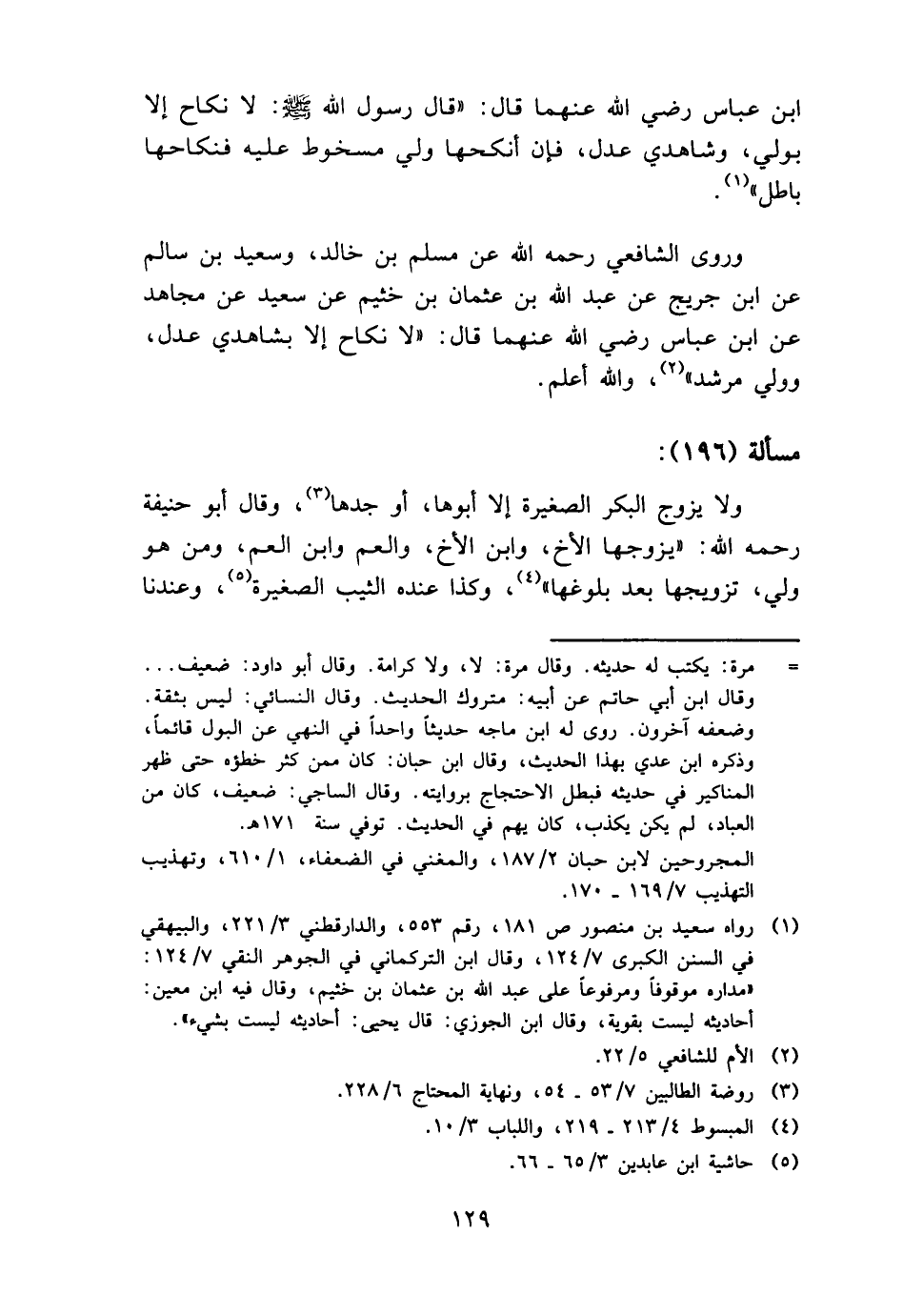 وروى الشَّافِعِي رَحمَه الله عَن مُسلم بن خَالِد، وَسَعِيد بن سَالم عَن ابْن جريج عَن عبد الله بن عُثْمَان بن خثيم عَن سعيد عَن مُجَاهِد عَن ابْن عَبَّاس رَضِي الله عَنْهُمَا قَالَ: " لَا نِكَاح إِلَّا بشاهدي عدل، وَولي مرشد "، وَالله أعلم.