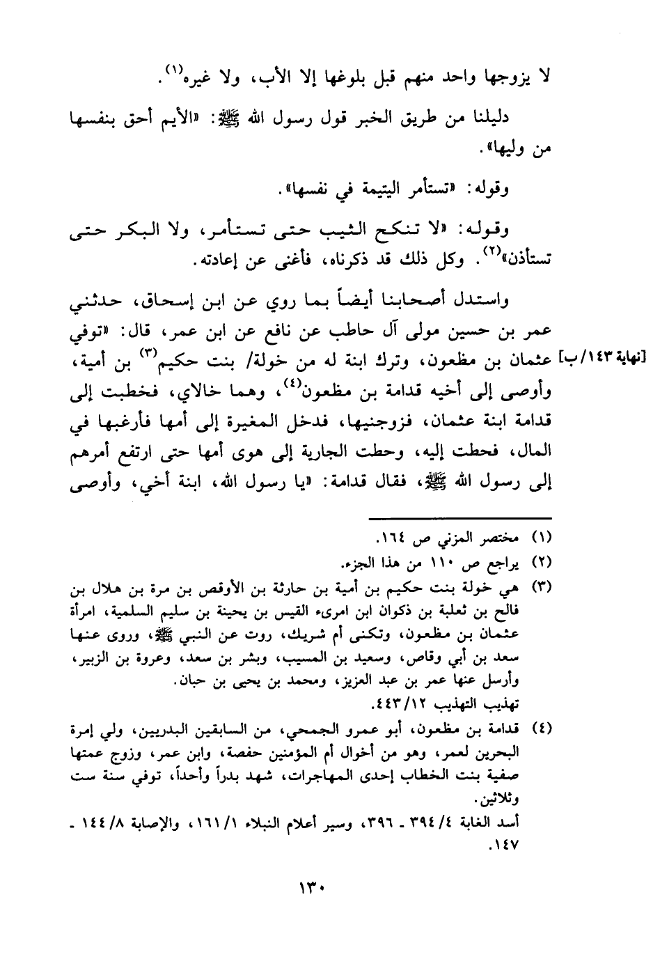وَاسْتدلَّ أَصْحَابنَا أَيْضا بِمَا رُوِيَ عَن ابْن إِسْحَاق، حَدثنِي عمر بن حُسَيْن مولى آل حَاطِب عَن نَافِع عَن ابْن عمر، قَالَ: " توفّي عُثْمَان بن مَظْعُون، وَترك ابْنة لَهُ من خَوْلَة بنت حَكِيم بن أُميَّة، وَأوصى إِلَى أَخِيه قدامَة بن مَظْعُون، وهما خالاي، فَخطبت إِلَى قدامَة ابْنة عُثْمَان، فزوجنيها، فَدخل الْمُغيرَة إِلَى أمهَا فأرغبها فِي المَال، فحطت إِلَيْهِ، وحطت الْجَارِيَة إِلَى هوى أمهَا حَتَّى ارْتَفع أَمرهم إِلَى رَسُول الله - صَلَّى اللَّهُ عَلَيْهِ وَسَلَّم َ -، فَقَالَ قدامَة: " يَا رَسُول الله، ابْنة أخي، وَأوصى