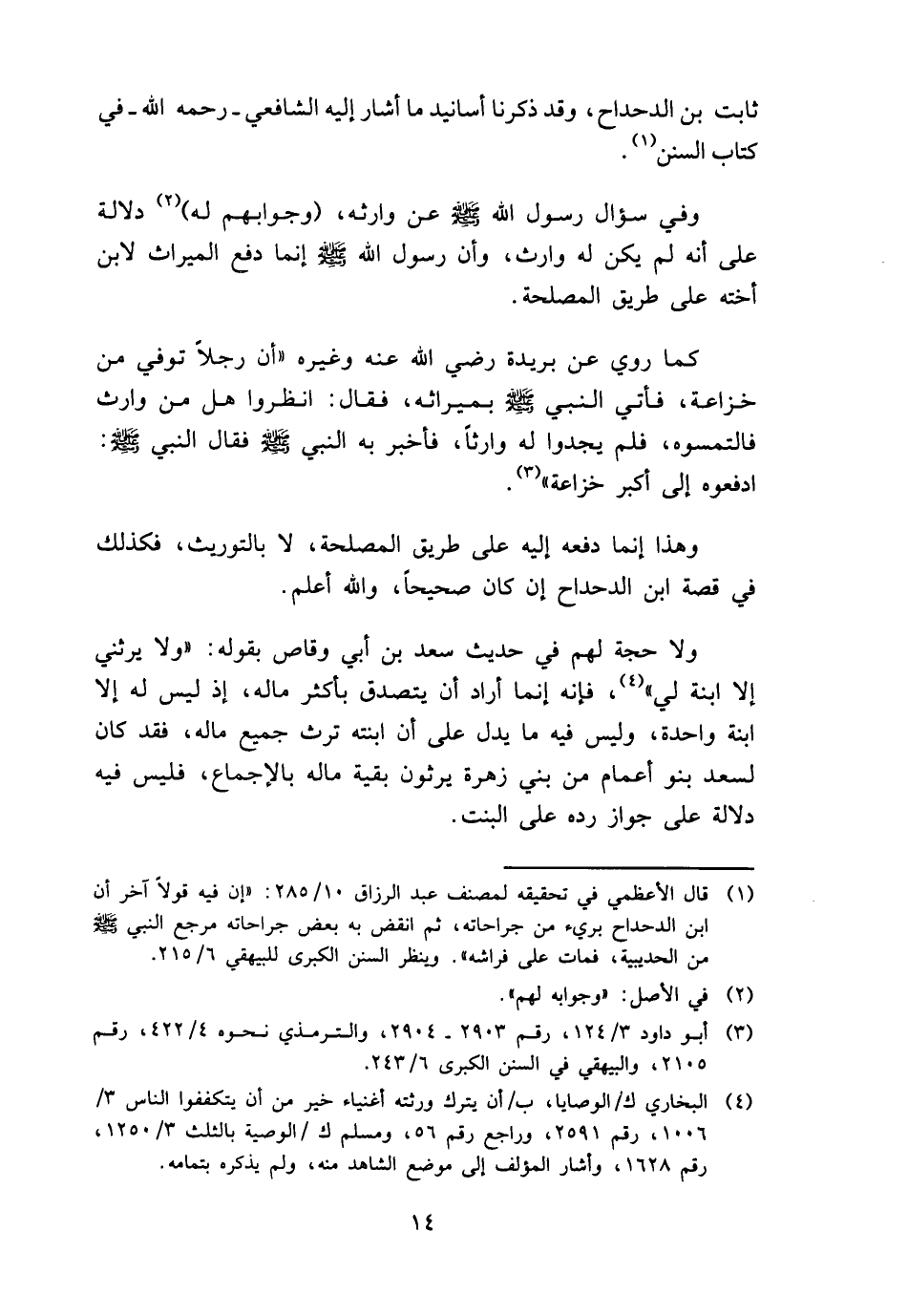 وَلَا حجَّة لَهُم فِي حَدِيث سعد بن أبي وَقاص بقوله: " وَلَا يَرِثنِي إِلَّا ابْنة لي "، فَإِنَّهُ إِنَّمَا أَرَادَ أَن يتَصَدَّق بِأَكْثَرَ مَاله، إِذْ لَيْسَ لَهُ إِلَّا ابْنة وَاحِدَة، وَلَيْسَ فِيهِ مَا يدل على أَن ابْنَته تَرث جَمِيع مَاله، فقد كَانَ لسعد بَنو أعمام من بني زهرَة يَرِثُونَ بَقِيَّة مَاله بِالْإِجْمَاع، فَلَيْسَ فِيهِ دلَالَة على جَوَاز رده على الْبِنْت.