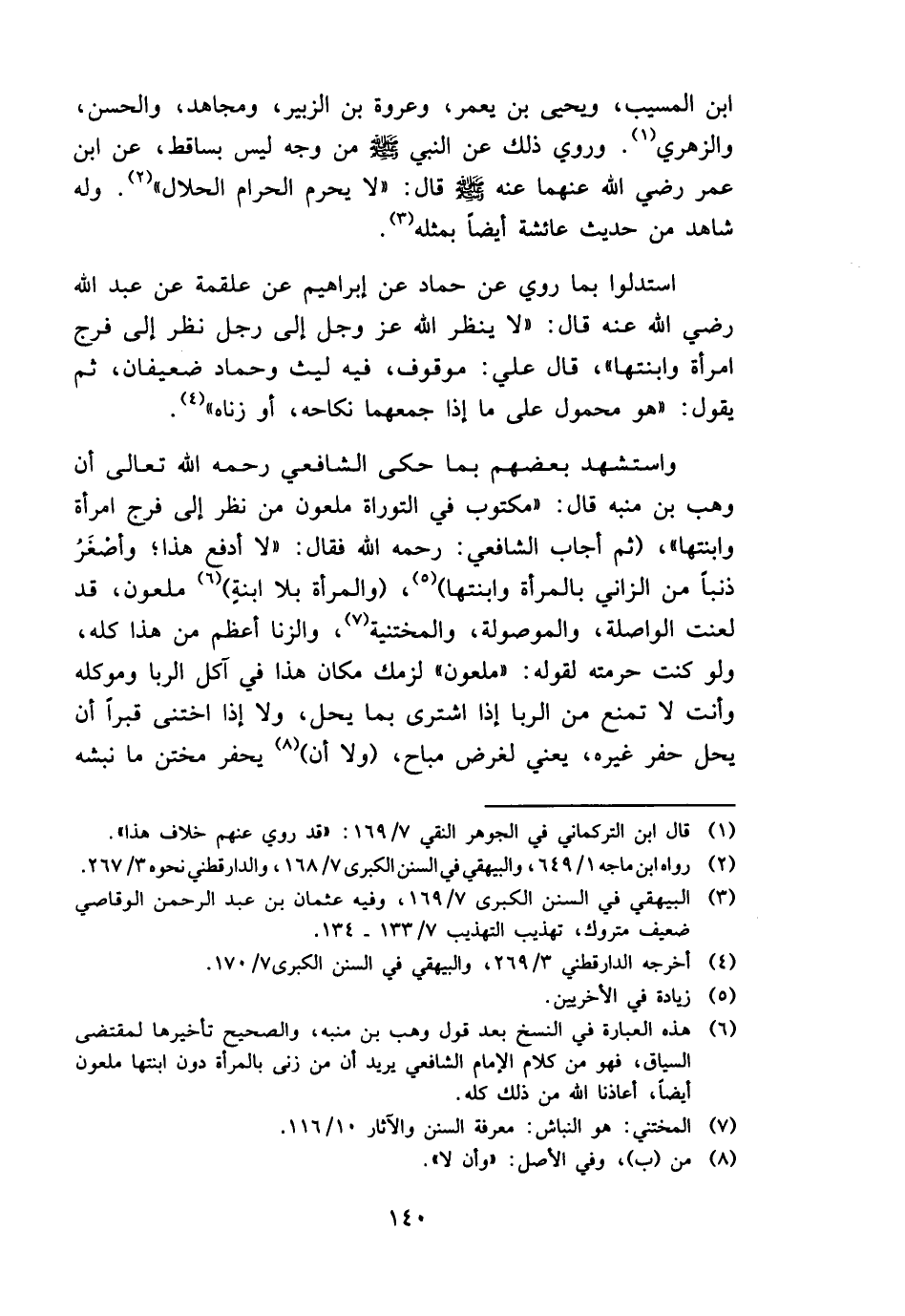وَاسْتشْهدَ بَعضهم بِمَا حكى الشَّافِعِي رَحمَه الله تَعَالَى أَن وهب بن مُنَبّه قَالَ: " مَكْتُوب فِي التَّوْرَاة مَلْعُون من نظر إِلَى فرج امْرَأَة وابنتها "، (ثمَّ أجَاب الشَّافِعِي: رَحمَه الله فَقَالَ: " لَا أدفَع هَذَا؛ وأصغر ذَنبا من الزَّانِي بِالْمَرْأَةِ وابنتها) ، (وَالْمَرْأَة بِلَا ابْنة) مَلْعُون، قد لعنت الْوَاصِلَة، والموصولة، والمختنية، وَالزِّنَا أعظم من هَذَا كُله، وَلَو كنت حرمته لقَوْله: " مَلْعُون " لزمك مَكَان هَذَا فِي آكل الرِّبَا وموكله وَأَنت لَا تمنع من الرِّبَا إِذا اشْترى بِمَا يحل، وَلَا إِذا اختنى قبرا أَن يحل حفر غَيره، يَعْنِي لغَرَض مُبَاح، (وَلَا أَن) يحْفر مختن مَا نبشه
