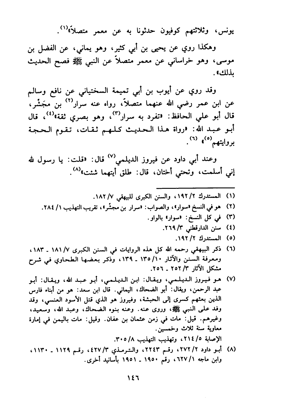 وَعند أبي دَاوُد عَن فَيْرُوز الديلمي قَالَ: " قلت: يَا رَسُول الله إِنِّي أسلمت، وتحتي أختَان، قَالَ: طلق أَيَّتهمَا شِئْت ".