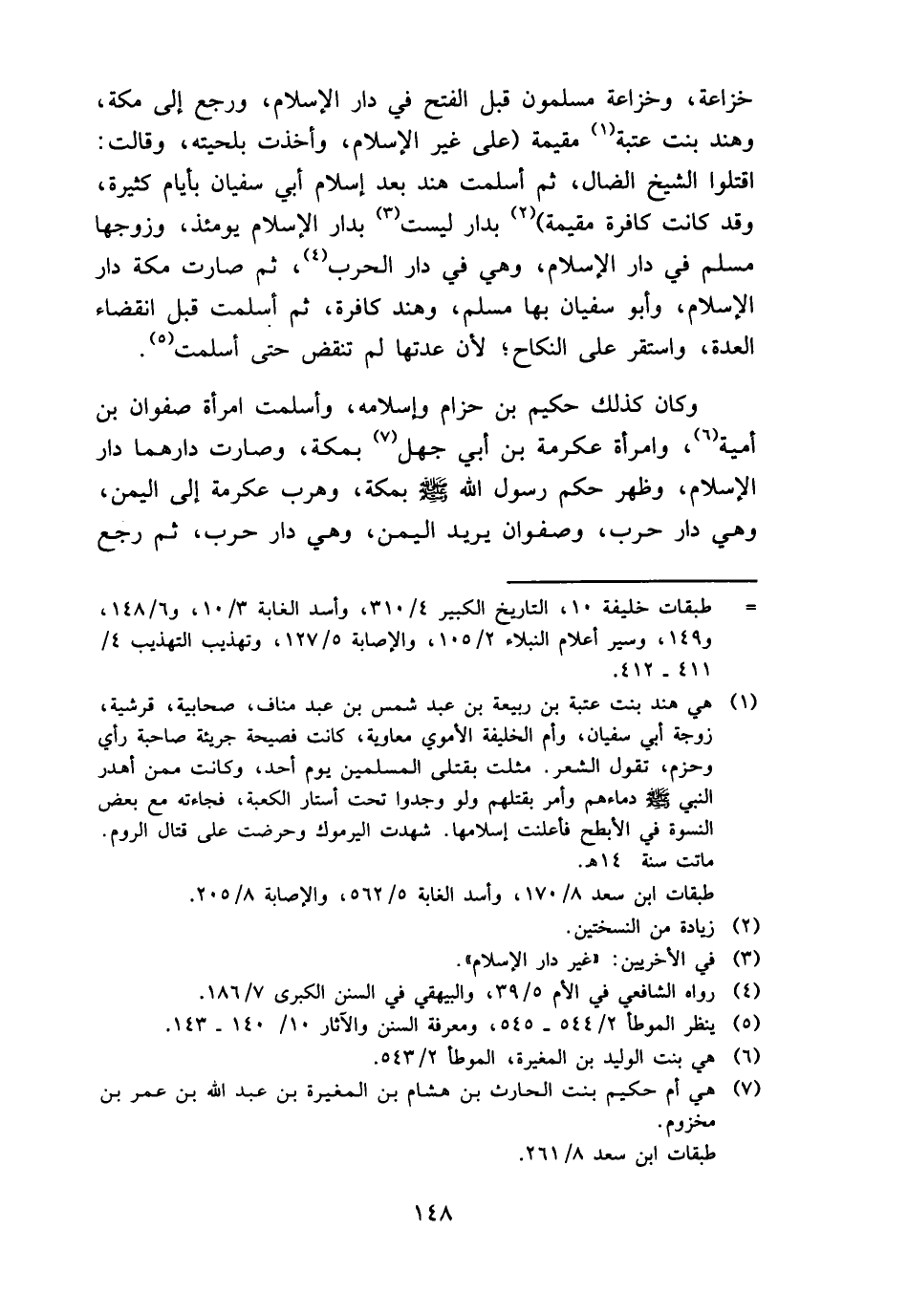 خُزَاعَة، وخزاعة مُسلمُونَ قبل الْفَتْح فِي دَار الْإِسْلَام، وَرجع إِلَى مَكَّة، وَهِنْد بنت عتبَة مُقِيمَة (على غير الْإِسْلَام، وَأخذت بلحيته، وَقَالَت: اقْتُلُوا الشَّيْخ الضال، ثمَّ أسلمت هِنْد بعد إِسْلَام أبي سُفْيَان بأيام كَثِيرَة، وَقد كَانَت كَافِرَة مُقِيمَة) بدار لَيست بدار الْإِسْلَام يَوْمئِذٍ، وَزوجهَا مُسلم فِي دَار الْإِسْلَام، وَهِي فِي دَار الْحَرْب، ثمَّ صَارَت مَكَّة دَار الْإِسْلَام، وَأَبُو سُفْيَان بهَا مُسلم، وَهِنْد كَافِرَة، ثمَّ أسلمت قبل انْقِضَاء الْعدة، وَاسْتقر على النِّكَاح؛ لِأَن عدتهَا لم تنقض حَتَّى أسلمت.