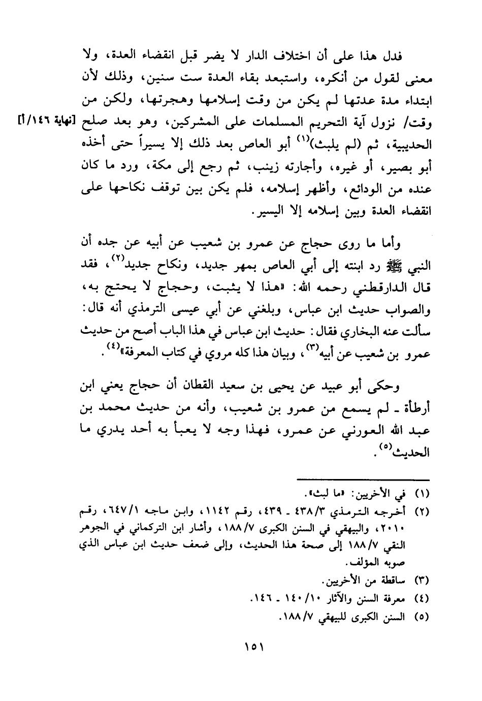 وَأما مَا روى حجاج عَن عَمْرو بن شُعَيْب عَن أَبِيه عَن جده أَن النَّبِي - صَلَّى اللَّهُ عَلَيْهِ وَسَلَّم َ - رد ابْنَته إِلَى أبي الْعَاصِ بِمهْر جَدِيد، وَنِكَاح جَدِيد، فقد قَالَ الدَّارَقُطْنِيّ رَحمَه الله: " هَذَا لَا يثبت، وحجاج لَا يحْتَج بِهِ، وَالصَّوَاب حَدِيث ابْن عَبَّاس، وَبَلغنِي عَن أبي عِيسَى التِّرْمِذِيّ أَنه قَالَ: سَأَلت عَنهُ البُخَارِيّ فَقَالَ: حَدِيث ابْن عَبَّاس فِي هَذَا الْبَاب أصح من حَدِيث عَمْرو بن شُعَيْب عَن أَبِيه، وَبَيَان هَذَا كُله مَرْوِيّ فِي كتاب الْمعرفَة ".