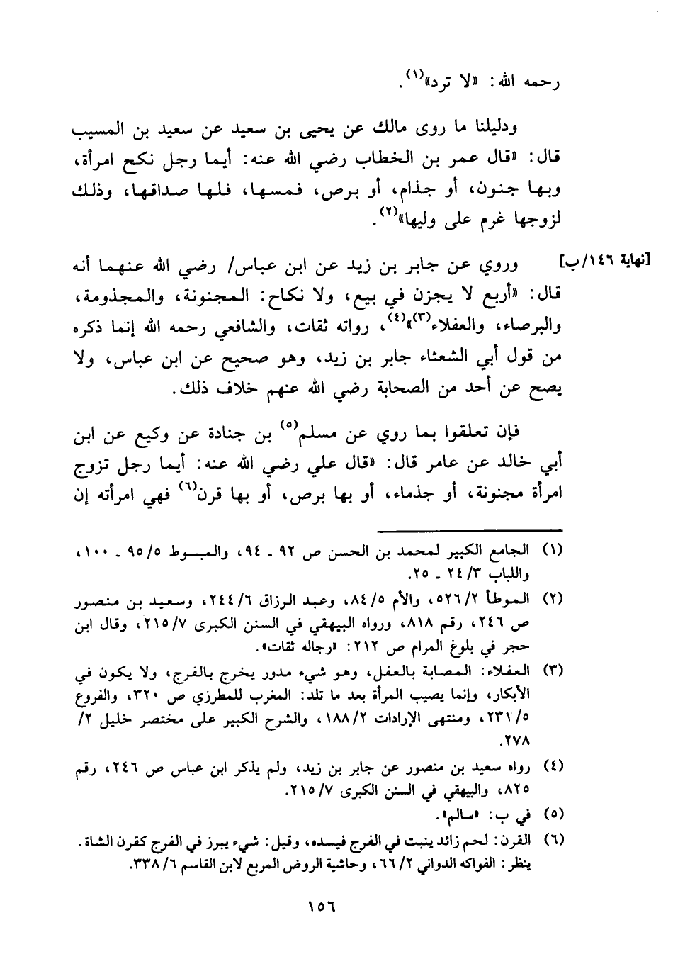 وَرُوِيَ عَن جَابر بن زيد عَن ابْن عَبَّاس رَضِي الله عَنْهُمَا أَنه قَالَ: " أَربع لَا يجزن فِي بيع، وَلَا نِكَاح: الْمَجْنُونَة، والمجذومة، والبرصاء، والعفلاء "، رُوَاته ثِقَات، وَالشَّافِعِيّ رَحمَه الله إِنَّمَا ذكره من قَول أبي الشعْثَاء جَابر بن زيد، وَهُوَ صَحِيح عَن ابْن عَبَّاس، وَلَا يَصح عَن أحد من الصَّحَابَة رَضِي الله عَنْهُم خلاف ذَلِك.