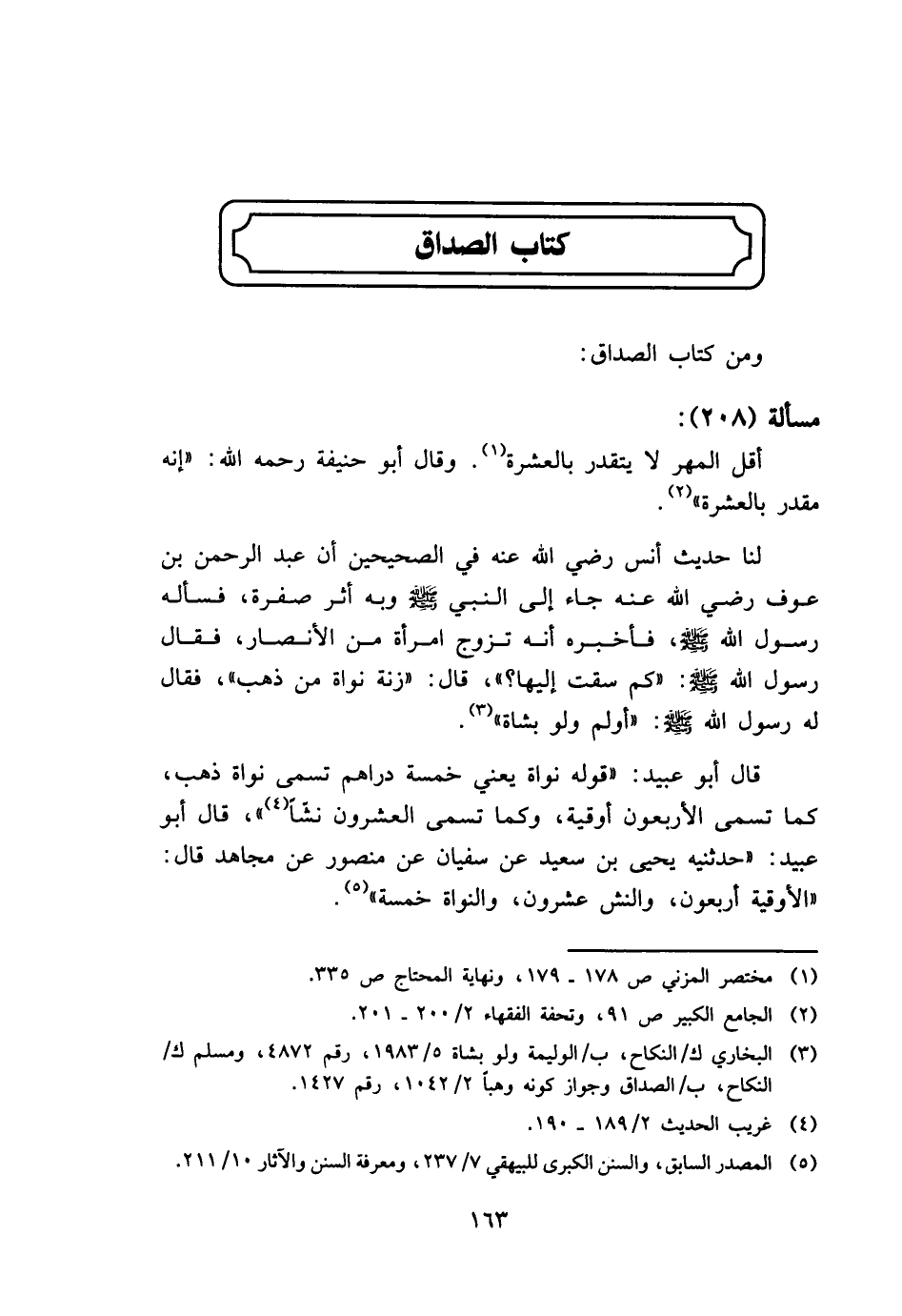 لنا حَدِيث انس رَضِي الله عَنهُ فِي الصَّحِيحَيْنِ أَن عبد الرَّحْمَن بن عَوْف رَضِي الله عَنهُ جَاءَ إِلَى النَّبِي - صَلَّى اللَّهُ عَلَيْهِ وَسَلَّم َ - وَبِه أثر صفرَة، فَسَأَلَهُ رَسُول الله - صَلَّى اللَّهُ عَلَيْهِ وَسَلَّم َ -، فَأخْبرهُ أَنه تزوج امْرَأَة من الْأَنْصَار، فَقَالَ رَسُول الله - صَلَّى اللَّهُ عَلَيْهِ وَسَلَّم َ -: " كم سقت إِلَيْهَا؟ "، قَالَ: " زنة نواة من ذهب "، فَقَالَ لَهُ رَسُول الله - صَلَّى اللَّهُ عَلَيْهِ وَسَلَّم َ -: " أولم وَلَو بِشَاة ".