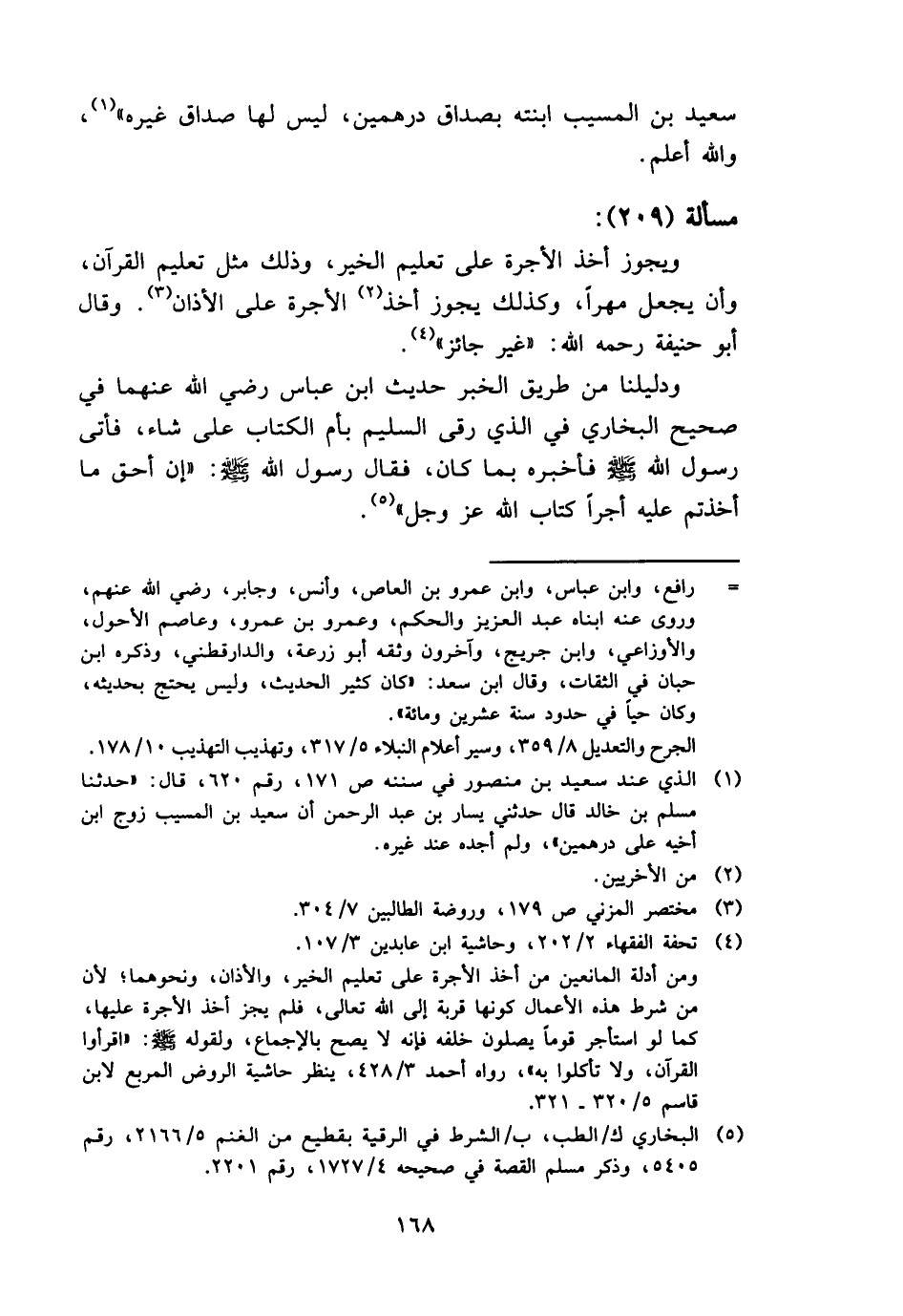 وَدَلِيلنَا من طَرِيق الْخَبَر حَدِيث ابْن عَبَّاس رَضِي الله عَنْهُمَا فِي صَحِيح البُخَارِيّ فِي الَّذِي رقى السَّلِيم بِأم الْكتاب على شَاءَ، فَأتى رَسُول الله - صَلَّى اللَّهُ عَلَيْهِ وَسَلَّم َ - فَأخْبرهُ بِمَا كَانَ، فَقَالَ رَسُول الله - صَلَّى اللَّهُ عَلَيْهِ وَسَلَّم َ -: " إِن احق مَا أَخَذْتُم عَلَيْهِ أجرا كتاب الله عز وَجل ".
