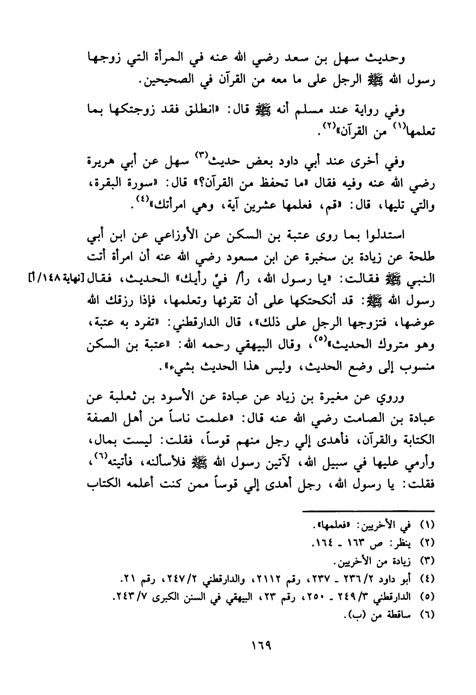 وَحَدِيث سهل بن سعد رَضِي الله عَنهُ فِي الْمَرْأَة الَّتِي زَوجهَا رَسُول الله - صَلَّى اللَّهُ عَلَيْهِ وَسَلَّم َ - الرجل على مَا مَعَه من الْقُرْآن فِي الصَّحِيحَيْنِ.