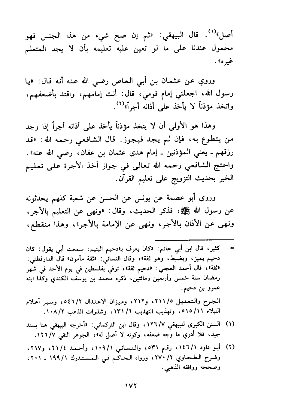 أصل ". قَالَ الْبَيْهَقِيّ: " ثمَّ إِن صَحَّ شَيْء من هَذَا الْجِنْس فَهُوَ مَحْمُول عندنَا على مَا لَو تعين عَلَيْهِ تَعْلِيمه بِأَن لَا يجد المتعلم غَيره ".