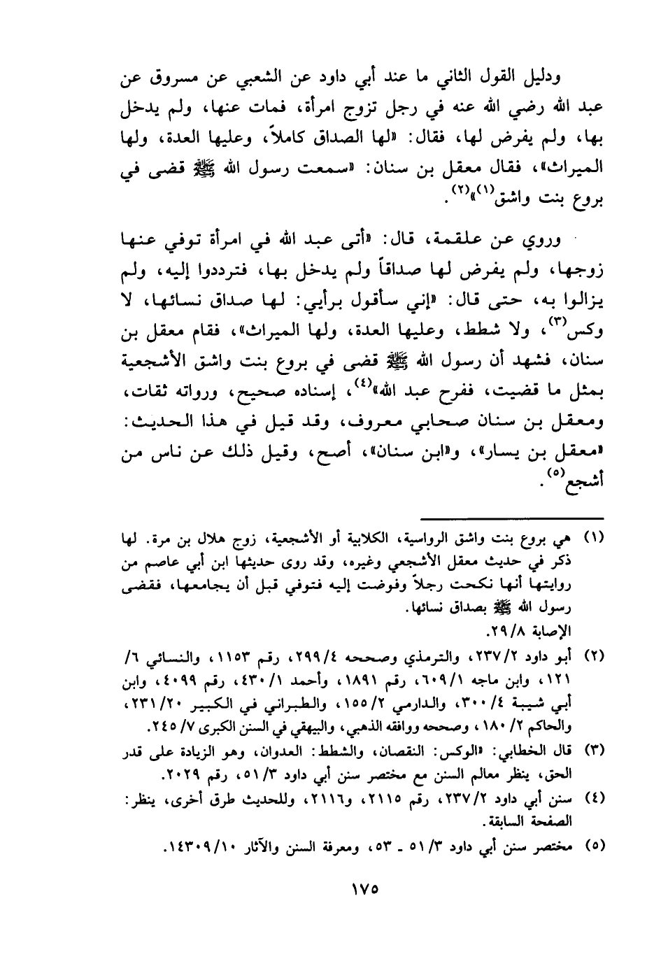 وَدَلِيل القَوْل الثَّانِي مَا عِنْد أبي دَاوُد عَن الشّعبِيّ عَن مَسْرُوق عَن عبد الله رَضِي الله عَنهُ فِي رجل تزوج امْرَأَة، فَمَاتَ عَنْهَا، وَلم يدْخل بهَا، وَلم يفْرض لَهَا، فَقَالَ: " لَهَا الصَدَاق كَامِلا، وَعَلَيْهَا الْعدة، وَلها الْمِيرَاث "، فَقَالَ معقل بن سِنَان: " سَمِعت رَسُول الله - صَلَّى اللَّهُ عَلَيْهِ وَسَلَّم َ - قضى فِي بروع بنت واشق ".