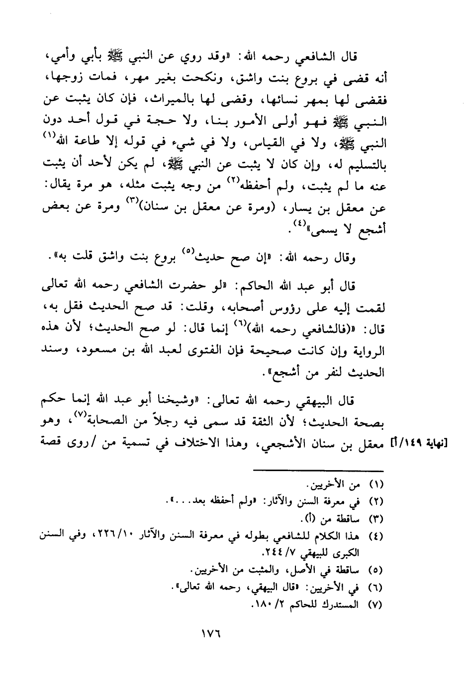 قَالَ الشَّافِعِي رَحمَه الله: " وَقد رُوِيَ عَن النَّبِي - صَلَّى اللَّهُ عَلَيْهِ وَسَلَّم َ - بِأبي وَأمي، أَنه قضى فِي بروع بنت واشق، ونكحت بِغَيْر مهر، فَمَاتَ زَوجهَا، فَقضى لَهَا بِمهْر نسائها، وَقضى لَهَا بِالْمِيرَاثِ، فَإِن كَانَ يثبت عَن النَّبِي - صَلَّى اللَّهُ عَلَيْهِ وَسَلَّم َ - فَهُوَ أولى الْأُمُور بِنَا، وَلَا حجَّة فِي قَول أحد دون النَّبِي - صَلَّى اللَّهُ عَلَيْهِ وَسَلَّم َ -، وَلَا فِي الْقيَاس، وَلَا فِي شَيْء فِي قَوْله إِلَّا طَاعَة الله بِالتَّسْلِيمِ لَهُ، وَإِن كَانَ لَا يثبت عَن النَّبِي - صَلَّى اللَّهُ عَلَيْهِ وَسَلَّم َ -، لم يكن لأحد أَن يثبت عَنهُ مَا لم يثبت، وَلم احفظه من وَجه يثبت مثله، وَهُوَ مرّة يُقَال: عَن معقل بن يسَار، (وَمرَّة عَن معقل بن سِنَان) وَمرَّة عَن بعض أَشْجَع لَا يُسمى ".