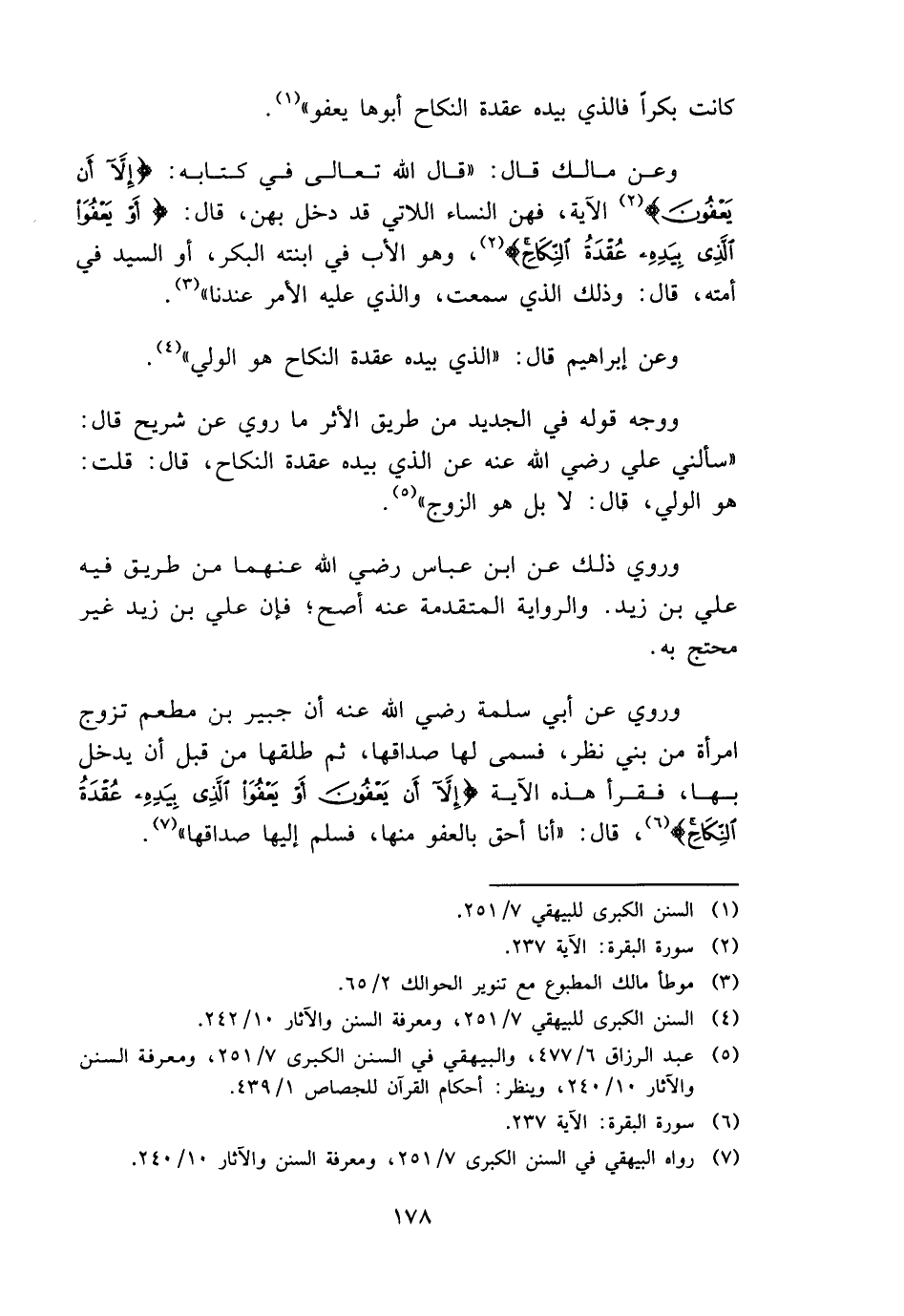وَرُوِيَ عَن أبي سَلمَة رَضِي الله عَنهُ أَن جُبَير بن مطعم تزوج امْرَأَة من بني نظر، فَسمى لَهَا صَدَاقهَا، ثمَّ طَلقهَا من قبل أَن يدْخل بهَا، فَقَرَأَ هَذِه الْآيَة {إِلَّا أَن يعفون أَو يعفوا الَّذِي بِيَدِهِ عقدَة النِّكَاح} ، قَالَ: " أَنا أَحَق بِالْعَفو مِنْهَا، فَسلم إِلَيْهَا صَدَاقهَا ".