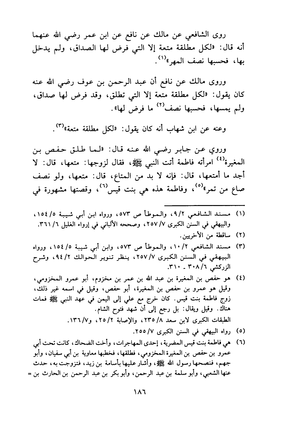روى الشَّافِعِي عَن مَالك عَن نَافِع عَن ابْن عمر رَضِي الله عَنْهُمَا أَنه قَالَ: " لكل مُطلقَة مُتْعَة إِلَّا الَّتِي فرض لَهَا الصَدَاق، وَلم يدْخل بهَا، فحسبها نصف الْمهْر ".