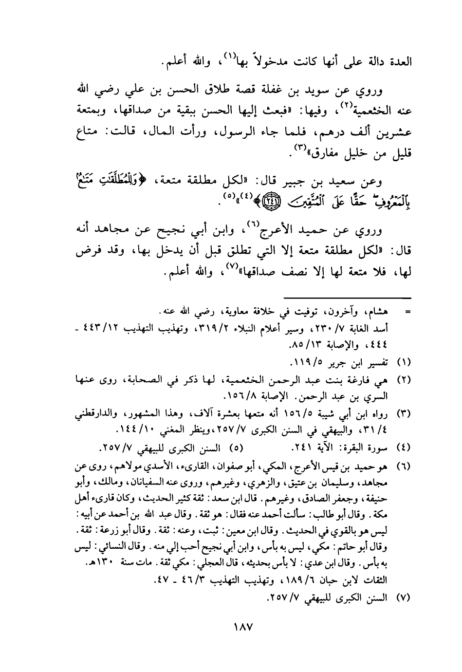 وروري عَن حميد الْأَعْرَج، وَابْن أبي نجيح عَن مُجَاهِد أَنه قَالَ: " لكل مُطلقَة مُتْعَة إِلَّا الَّتِي تطلق قبل أَن يدْخل بهَا، وَقد فرض لَهَا، فَلَا مُتْعَة لَهَا إِلَّا نصف صَدَاقهَا "، وَالله أعلم.