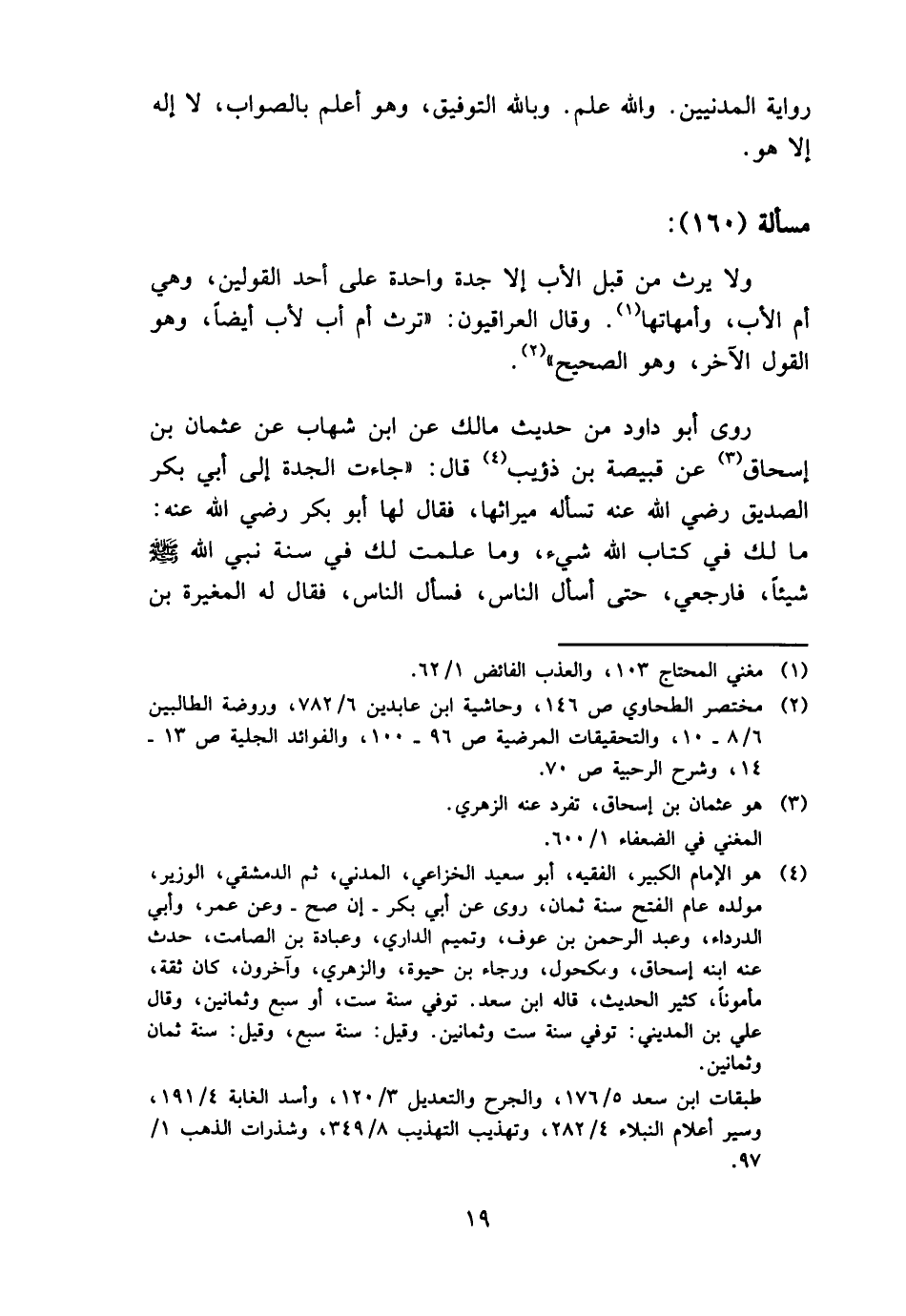 روى أَبُو دَاوُد من حَدِيث مَالك عَن ابْن شهَاب عَن عُثْمَان بن إِسْحَاق عَن قبيصَة بن ذُؤَيْب قَالَ: " جَاءَت الْجدّة إِلَى أبي بكر الصّديق رَضِي الله عَنهُ تسأله مِيرَاثهَا، فَقَالَ لَهَا أَبُو بكر رَضِي الله عَنهُ: مَا لَك فِي كتاب الله شَيْء، وَمَا علمت لَك فِي سنة نَبِي الله - صَلَّى اللَّهُ عَلَيْهِ وَسَلَّم َ - شَيْئا، فارجعي، حَتَّى أسأَل النَّاس، فَسَأَلَ النَّاس، فَقَالَ لَهُ الْمُغيرَة بن
