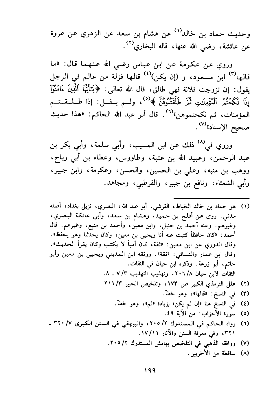 وَرُوِيَ عَن عِكْرِمَة عَن ابْن عَبَّاس رَضِي الله عَنْهُمَا قَالَ: " مَا قَالَهَا ابْن مَسْعُود، و (إِن يكن) قَالَهَا فزلة من عَالم فِي الرجل يَقُول: إِن تزوجت فُلَانَة فَهِيَ طَالِق، قَالَ الله تَعَالَى: {يَا أَيهَا الَّذين ءامنوا إِذا نكحتم الْمُؤْمِنَات ثمَّ طلقتموهن} ، وَلم يقل: إِذا طلّقْتُم الْمُؤْمِنَات، ثمَّ نكحتموهن ". قَالَ أَبُو عبد الله الْحَاكِم: " هَذَا حَدِيث صَحِيح الْإِسْنَاد ".