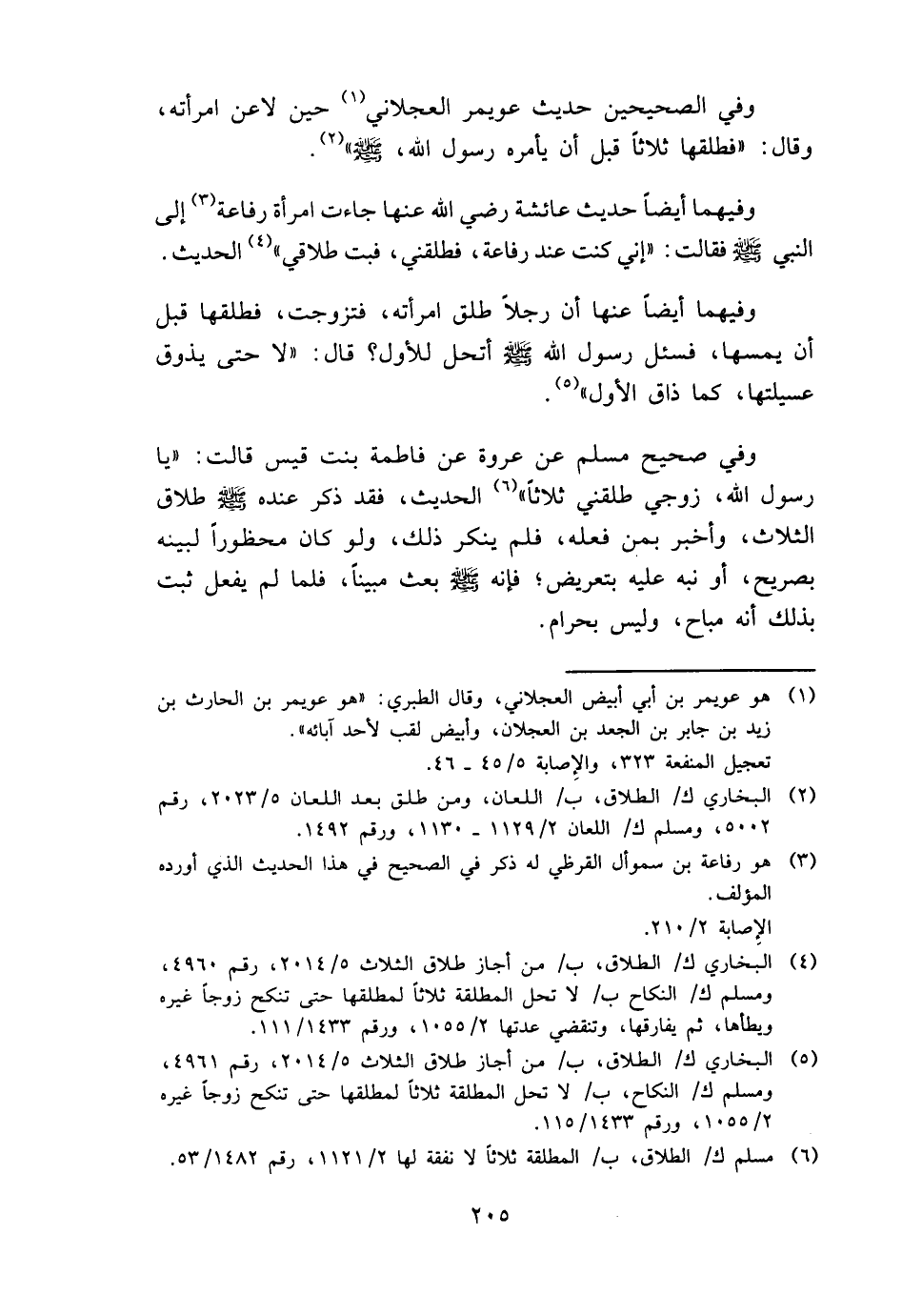 وَفِي صَحِيح مُسلم عَن عُرْوَة عَن فَاطِمَة بنت قيس قَالَت: " يَا رَسُول الله، زَوجي طَلقنِي ثَلَاثًا " الحَدِيث، فقد ذكر عِنْده - صَلَّى اللَّهُ عَلَيْهِ وَسَلَّم َ - طَلَاق الثَّلَاث، وَأخْبر بِمن فعله، فَلم يُنكر ذَلِك، وَلَو كَانَ مَحْظُورًا لبينه بِصَرِيح، أَو نبه عَلَيْهِ بتعريض؛ فَإِنَّهُ - صَلَّى اللَّهُ عَلَيْهِ وَسَلَّم َ - بعث مُبينًا، فَلَمَّا لم يفعل ثَبت بذلك أَنه مُبَاح، وَلَيْسَ بِحرَام.