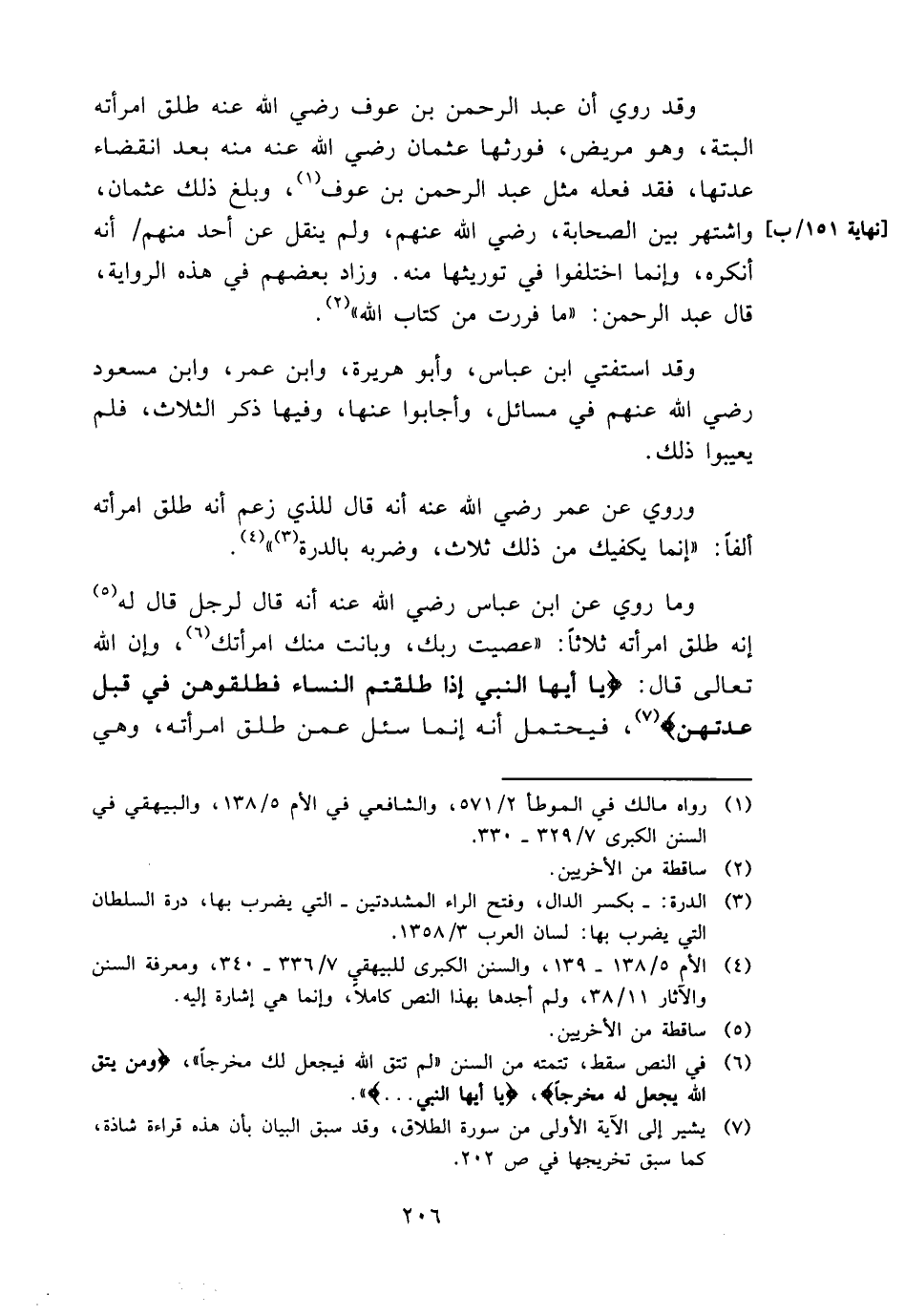 وَقد رُوِيَ أَن عبد الرَّحْمَن بن عَوْف رَضِي الله عَنهُ طلق امْرَأَته الْبَتَّةَ، وَهُوَ مَرِيض، فَورثَهَا عُثْمَان رَضِي الله عَنهُ مِنْهُ بعد انْقِضَاء عدتهَا، فقد فعله مثل عبد الرَّحْمَن بن عَوْف، وَبلغ ذَلِك عُثْمَان، واشتهر بَين الصَّحَابَة، رَضِي الله عَنْهُم، وَلم ينْقل عَن أحد مِنْهُم أَنه أنكرهُ، وَإِنَّمَا اخْتلفُوا فِي توريثها مِنْهُ. وَزَاد بَعضهم فِي هَذِه الرِّوَايَة، قَالَ عبد الرَّحْمَن: " مَا فَرَرْت من كتاب الله ".