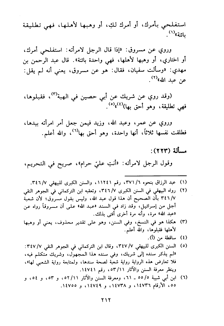 وَرُوِيَ عَن مَسْرُوق: " إِذا قَالَ الرجل لامْرَأَته: استفلحي أَمرك، أَو اخْتَارِي، أَو وَهبهَا لأَهْلهَا، فَهِيَ وَاحِدَة بَائِنَة ". قَالَ عبد الرَّحْمَن بن مهْدي: " وَسَأَلت سُفْيَان، فَقَالَ: هُوَ عَن مَسْرُوق، يَعْنِي أَنه لم يقل: عَن عبد الله ".