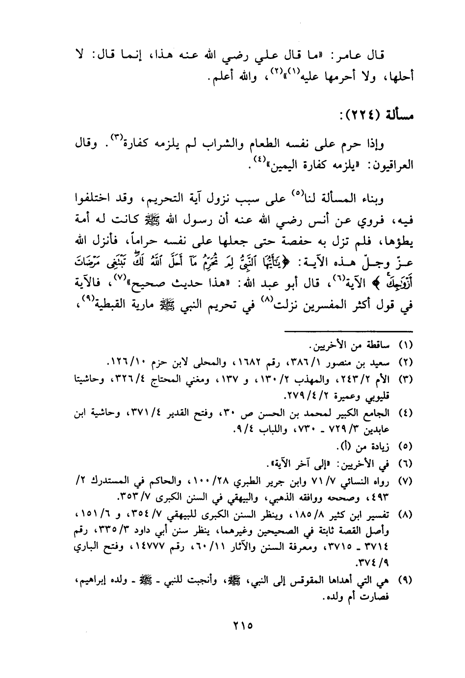 قَالَ عَامر: " مَا قَالَ عَليّ رَضِي الله عَنهُ هَذَا، إِنَّمَا قَالَ: لَا أحلهَا، وَلَا أحرمهَا عَلَيْهِ "، وَالله أعلم.