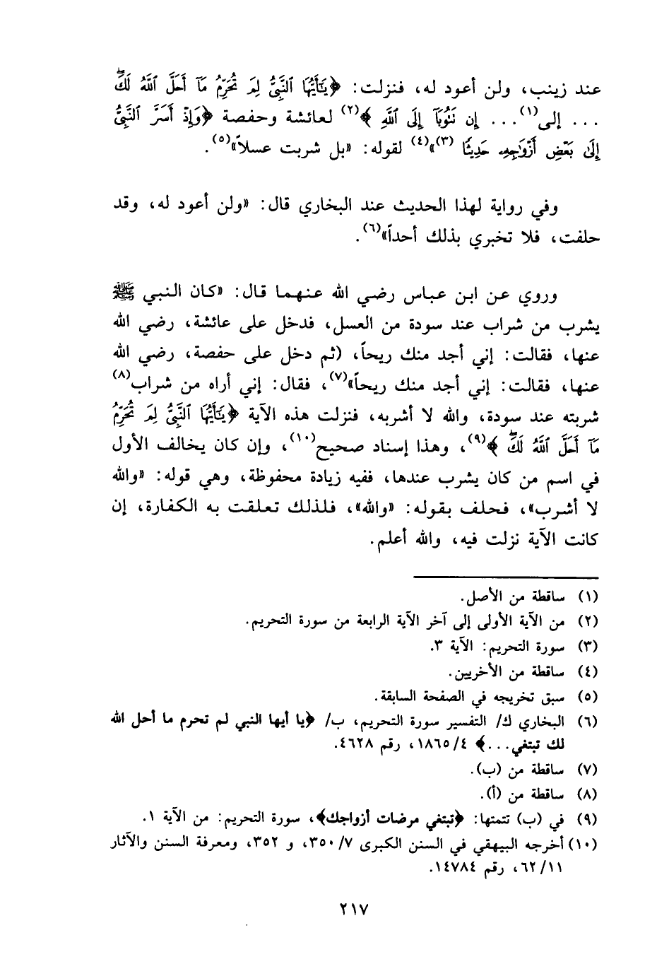 عِنْد زَيْنَب، وَلنْ أَعُود لَهُ، فَنزلت: {يَا أَيهَا النَّبِي لم تحرم مَا أحل الله لَك ... إِلَى ... إِن تَتُوبَا إِلَى الله} لعَائِشَة وَحَفْصَة (وَإِذ أسر النَّبِي إِلَى بعض أَزوَاجه حَدِيثا " لقَوْله: " بل شربت عسلا ".