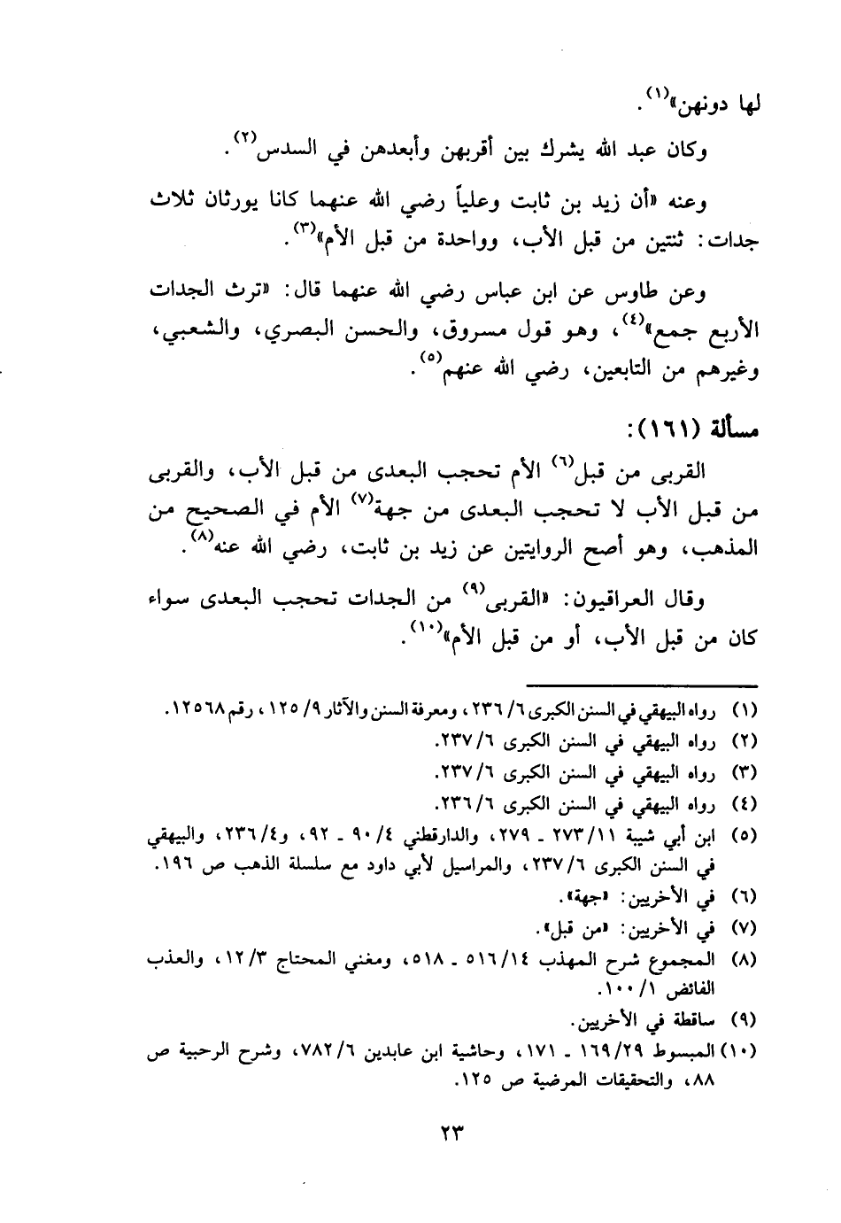 الْقُرْبَى من قبل الْأُم تحجب البعدى من قبل الْأَب، والقربى من قبل الْأَب لَا تحجب البعدى من جِهَة الْأُم فِي الصَّحِيح من الْمَذْهَب، وَهُوَ أصح الرِّوَايَتَيْنِ عَن زيد بن ثَابت، رَضِي الله عَنهُ.