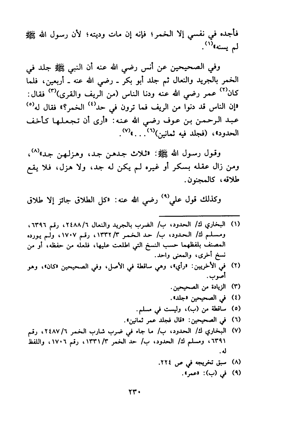 وَفِي الصَّحِيحَيْنِ عَن أنس رَضِي الله عَنهُ أَن النَّبِي - صَلَّى اللَّهُ عَلَيْهِ وَسَلَّم َ - جلد فِي الْخمر بِالْجَرِيدِ وَالنعال ثمَّ جلد أَبُو بكر - رَضِي الله عَنهُ - أَرْبَعِينَ، فَلَمَّا كَانَ عمر رَضِي الله عَنهُ ودنا النَّاس (من الرِّيف والقرى) فَقَالَ: " إِن النَّاس قد دنوا من الرِّيف فَمَا ترَوْنَ فِي حد الْخمر؟ " فَقَالَ لَهُ عبد الرَّحْمَن بن عَوْف رَضِي الله عَنهُ: " أرى أَن تجعلها كأخف الْحُدُود "، (فجلد فِيهِ ثَمَانِينَ)