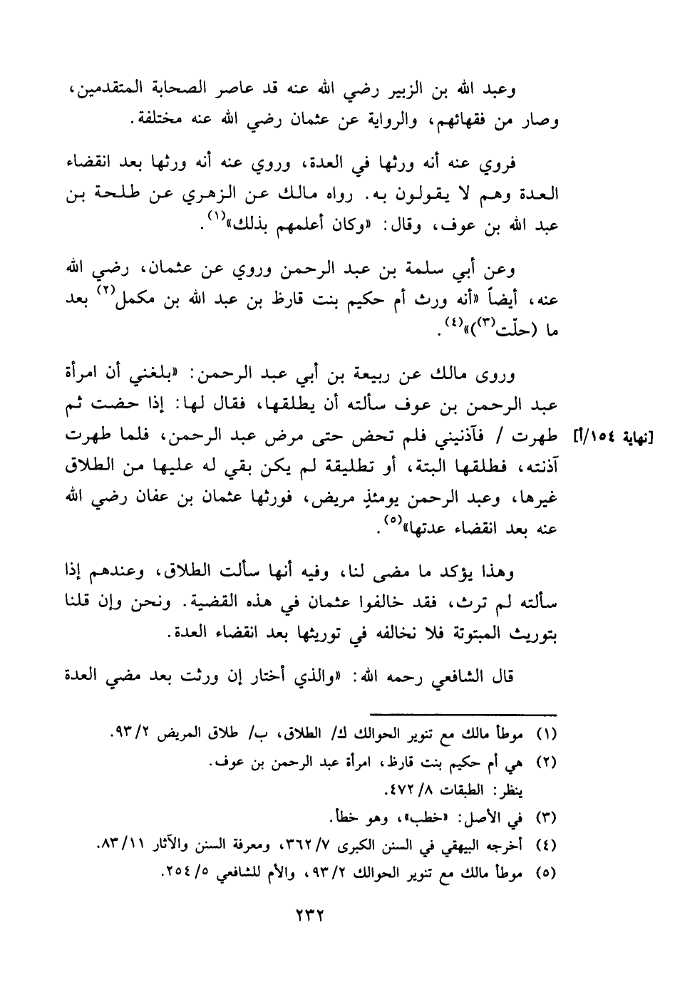 وَعَن أبي سَلمَة بن عبد الرَّحْمَن وَرُوِيَ عَن عُثْمَان، رَضِي الله عَنهُ، أَيْضا " أَنه ورث أم حَكِيم بنت قارظ بن عبد الله بن مكمل بعد مَا (حلت) ".