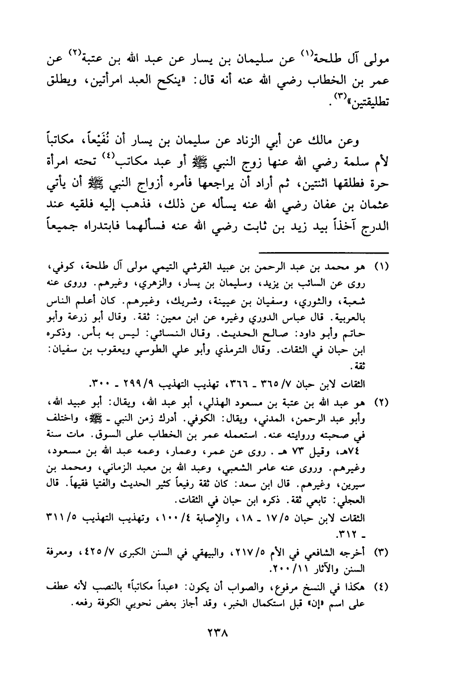 مولى آل طَلْحَة عَن سُلَيْمَان بن يسَار عَن عبد الله بن عتبَة عَن عمر بن الْخطاب رَضِي الله عَنهُ أَنه قَالَ: " ينْكح العَبْد امْرَأتَيْنِ، وَيُطلق تَطْلِيقَتَيْنِ ".