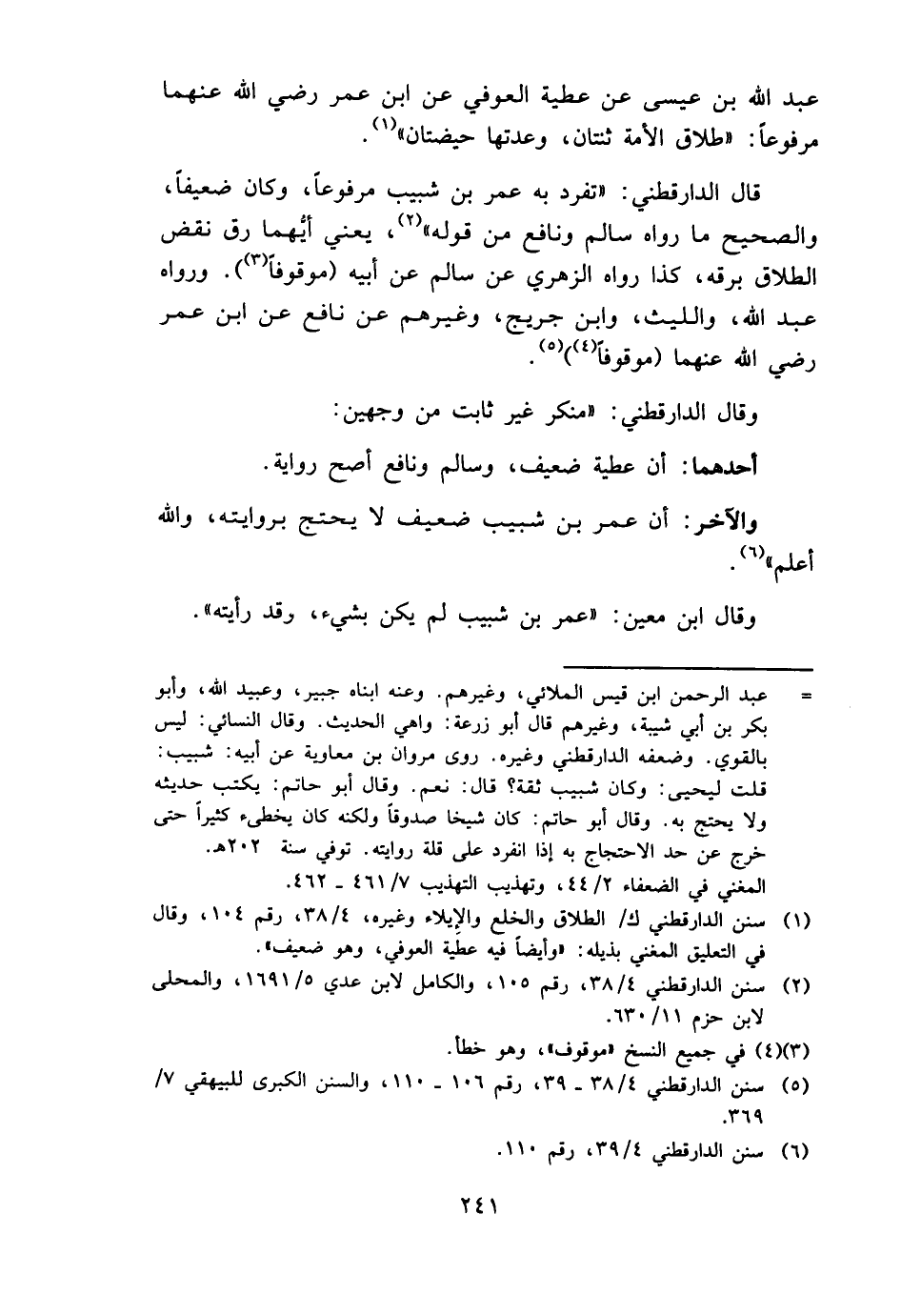 قَالَ الدَّارَقُطْنِيّ: " تفرد بِهِ عمر بن شبيب مَرْفُوعا، وَكَانَ ضَعِيفا، وَالصَّحِيح مَا رَوَاهُ سَالم وَنَافِع من قَوْله "، يَعْنِي أَيهمَا رق نقض الطَّلَاق برقه، كَذَا رَوَاهُ الزُّهْرِيّ عَن سَالم عَن أَبِيه (مَوْقُوفا) . وَرَوَاهُ عبد الله، وَاللَّيْث، وَابْن جريج، وَغَيرهم عَن نَافِع عَن ابْن عمر رَضِي الله عَنْهُمَا (مَوْقُوفا) .
