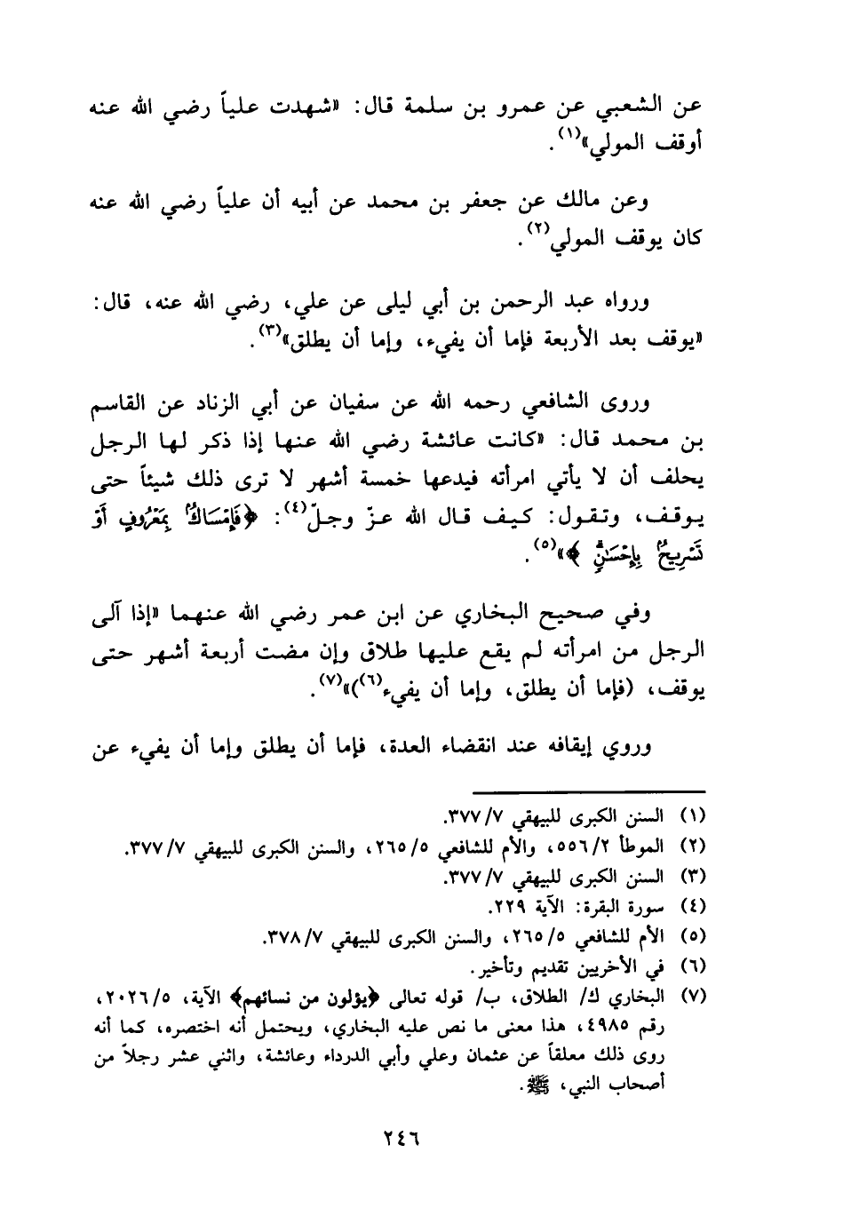وروى الشَّافِعِي رَحمَه الله عَن سُفْيَان عَن أبي الزِّنَاد عَن الْقَاسِم بن مُحَمَّد قَالَ: " كَانَت عَائِشَة رَضِي الله عَنْهَا إِذا ذكر لَهَا الرجل يحلف أَن لَا يَأْتِي امْرَأَته فيدعها خَمْسَة أشهر لَا ترى ذَلِك شَيْئا حَتَّى يُوقف، وَتقول: كَيفَ قَالَ الله عز وَجل: {فإمساك بِمَعْرُوف أَو تَسْرِيح بِإِحْسَان} ".