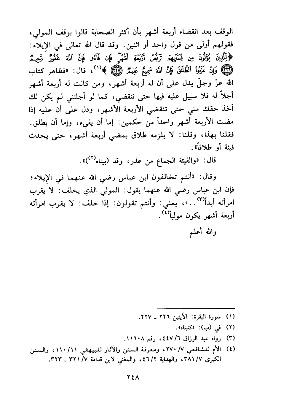 الْوَقْف بعد انْقِضَاء أَرْبَعَة أشهر بِأَن أَكثر الصَّحَابَة قَالُوا بوقف الْمولي، فَقَوْلهم أولى من قَول وَاحِد أَو اثْنَيْنِ. وَقد قَالَ الله تَعَالَى فِي الْإِيلَاء: {للَّذين يؤلون من نِسَائِهِم تربص أَرْبَعَة أشهر فَإِن فاءو فَإِن الله غَفُور رَحِيم (226) وَإِن عزموا الطَّلَاق فَإِن الله سميع عليم (227) } ، قَالَ: " فَظَاهر كتاب الله عز وَجل يدل على أَن لَهُ أَرْبَعَة أشهر، وَمن وَكَانَت لَهُ أَرْبَعَة أشهر أَََجَلًا لَهُ فَلَا سَبِيل عَلَيْهِ فِيهَا حَتَّى تَنْقَضِي، كَمَا لَو أجلتني لم يكن لَك أَخذ حَقك مني حَتَّى تَنْقَضِي الْأَرْبَعَة الْأَشْهر، وَدلّ على أَن عَلَيْهِ إِذا مَضَت الْأَرْبَعَة أشهر وَاحِدًا من حكمين: إِمَّا أَن يفِيء، وَإِمَّا أَن يُطلق. فَقُلْنَا بِهَذَا، وَقُلْنَا: لَا يلْزمه طَلَاق بِمُضِيِّ أَرْبَعَة أشهر، حَتَّى يحدث فيئة أَو طَلَاقا ".