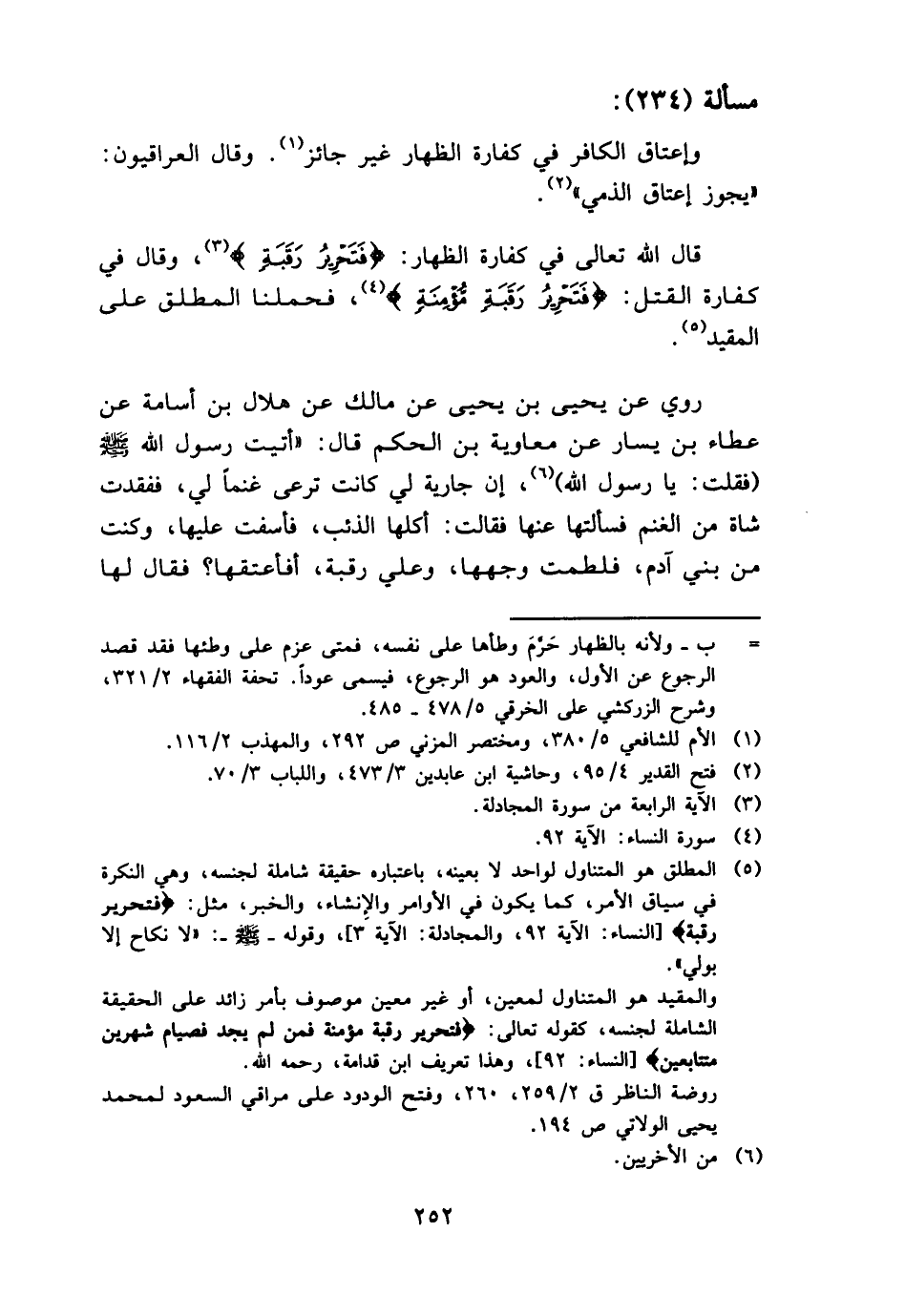 قَالَ الله تَعَالَى فِي كَفَّارَة الظِّهَار: {فَتَحْرِير رَقَبَة} ، وَقَالَ فِي كَفَّارَة الْقَتْل: {فَتَحْرِير رَقَبَة مُؤمنَة} ، فحملنا الْمُطلق على الْمُقَيد.