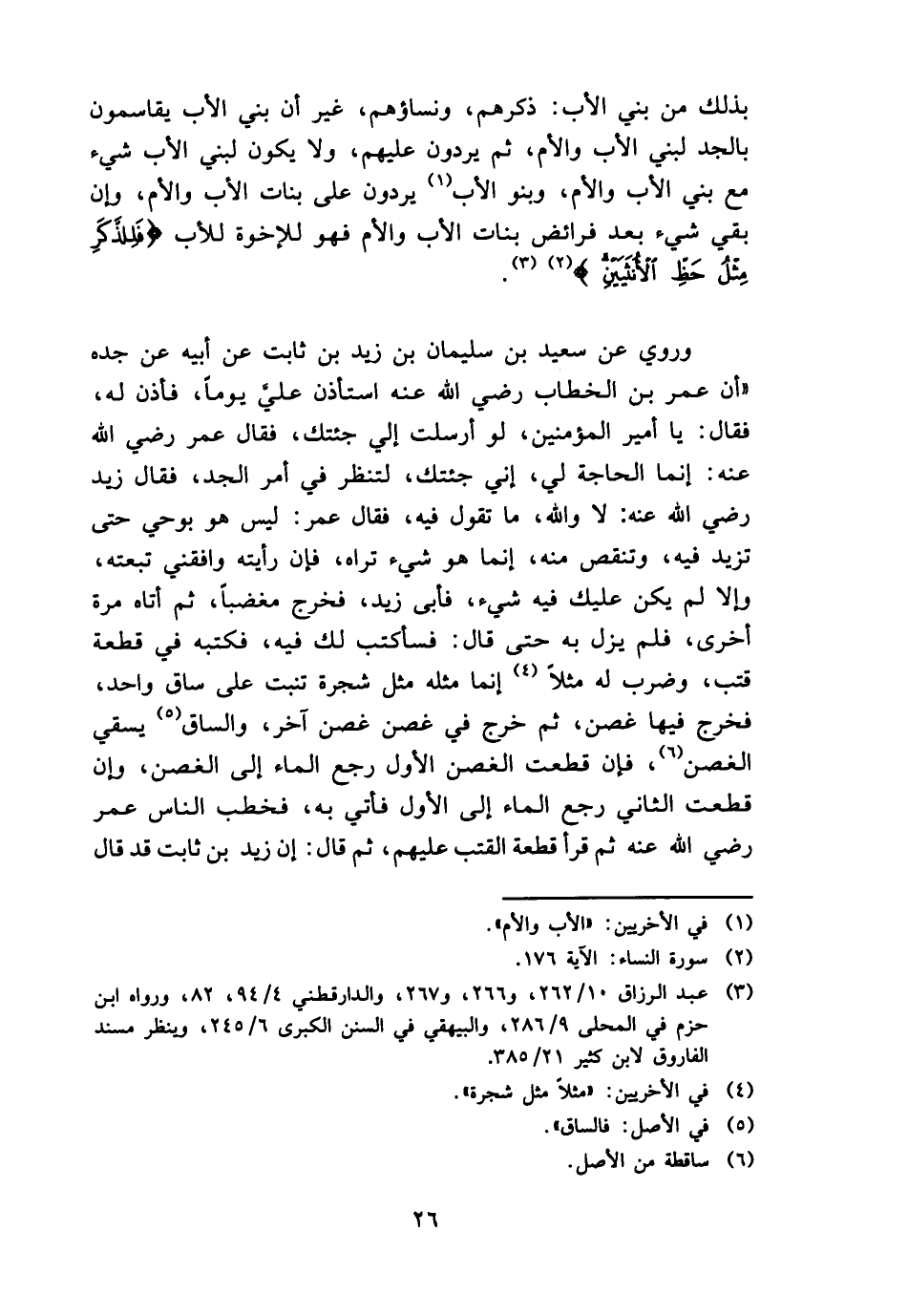 وَرُوِيَ عَن سعيد بن سُلَيْمَان بن زيد بن ثَابت عَن أَبِيه عَن جده " أَن عمر بن الْخطاب رَضِي الله عَنهُ اسْتَأْذن عَليّ يَوْمًا، فَأذن لَهُ، فَقَالَ: يَا أَمِير الْمُؤمنِينَ، لَو أرْسلت إِلَيّ جئْتُك، فَقَالَ عمر رَضِي الله عَنهُ: إِنَّمَا الْحَاجة لي، إِنِّي جئْتُك لتنظر فِي أَمر الْجد، فَقَالَ زيد رَضِي الله عَنهُ: لَا وَالله، مَا تَقول فِيهِ، فَقَالَ عمر: لَيْسَ هُوَ بِوَحْي حَتَّى تزيد فِيهِ، وتنقص مِنْهُ، إِنَّمَا هُوَ شَيْء ترَاهُ، فَإِن رَأَيْته واقفني تَبعته، وَإِلَّا لم يكن عَلَيْك فِيهِ شَيْء، فَأبى زيد، فَخرج مغضبا، ثمَّ أَتَاهُ مرّة أُخْرَى، فَلم يزل بِهِ حَتَّى قَالَ: فسأكتب لَك فِيهِ، فَكَتبهُ فِي قِطْعَة قتب، وَضرب لَهُ مثلا إِنَّمَا مثله مثل شَجَرَة تنْبت على سَاق وَاحِد، فَخرج فِيهَا غُصْن، ثمَّ خرج فِي غُصْن غُصْن آخر، والساق يسْقِي الْغُصْن، فَإِن قطعت الْغُصْن الأول رَجَعَ المَاء إِلَى الْغُصْن، وَإِن قطعت الثَّانِي رَجَعَ المَاء إِلَى الأول فَأتي بِهِ، فَخَطب النَّاس عمر رَضِي الله عَنهُ ثمَّ قَرَأَ قِطْعَة القتب عَلَيْهِم، ثمَّ قَالَ: إِن زيد بن ثَابت قد قَالَ