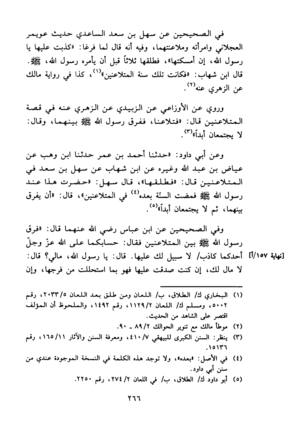 فِي الصَّحِيحَيْنِ عَن سهل بن سعد السَّاعِدِيّ حَدِيث عُوَيْمِر الْعجْلَاني وَامْرَأَته وملاعنتهما، وَفِيه أَنه قَالَ لما فرغا: " كذبت عَلَيْهَا يَا رَسُول الله، إِن أَمْسَكتهَا "، فَطلقهَا ثَلَاثًا قبل أَن يَأْمُرهُ رَسُول الله، - صَلَّى اللَّهُ عَلَيْهِ وَسَلَّم َ -. قَالَ ابْن شهَاب: " فَكَانَت تِلْكَ سنة المتلاعنين "، كَذَا فِي رِوَايَة مَالك عَن الزُّهْرِيّ عَنهُ.