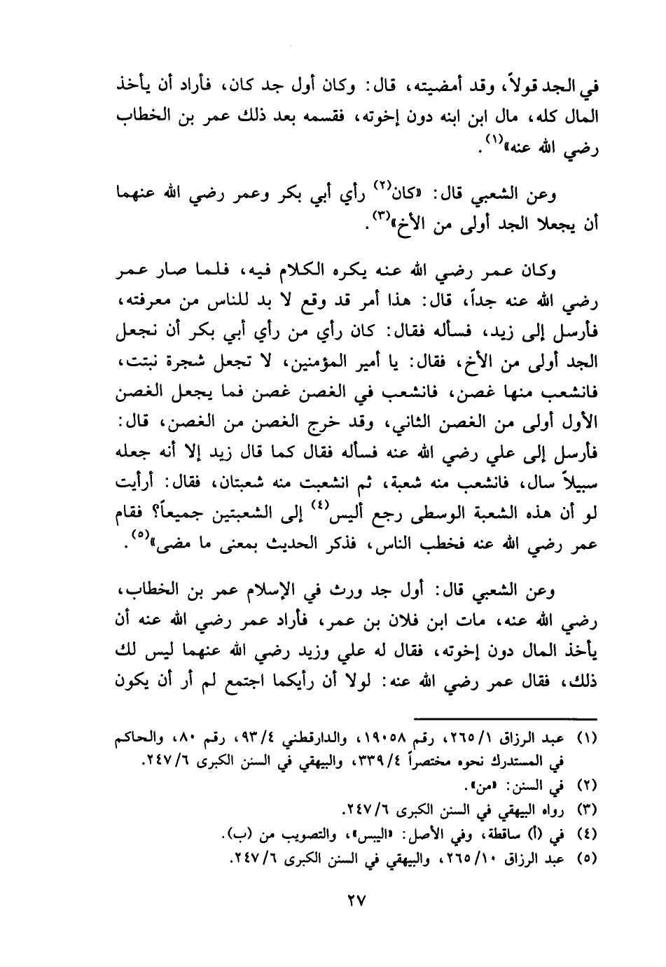 وَعَن الشّعبِيّ قَالَ: أول جد ورث فِي الْإِسْلَام عمر بن الْخطاب، رَضِي الله عَنهُ، مَاتَ ابْن فلَان بن عمر، فَأَرَادَ عمر رَضِي الله عَنهُ أَن يَأْخُذ المَال دون إخْوَته، فَقَالَ لَهُ عَليّ وَزيد رَضِي الله عَنْهُمَا لَيْسَ لَك ذَلِك، فَقَالَ عمر رَضِي الله عَنهُ: لَوْلَا أَن رأيكما اجْتمع لم أر أَن يكون