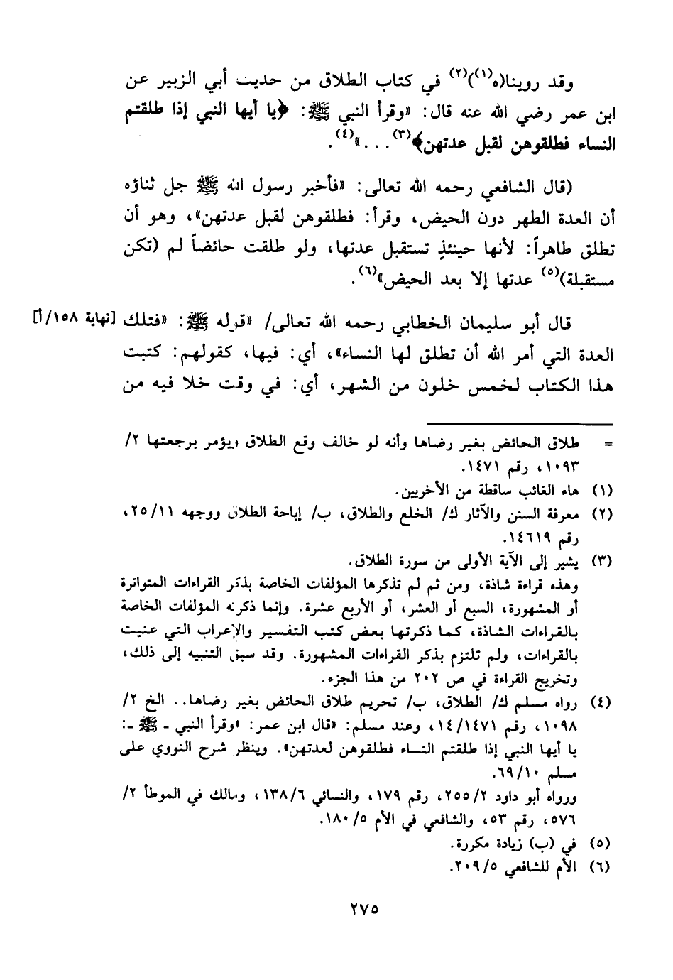 (قَالَ الشَّافِعِي رَحمَه الله تَعَالَى: " فَأخْبر رَسُول الله - صَلَّى اللَّهُ عَلَيْهِ وَسَلَّم َ - جلّ ثَنَاؤُهُ أَن الْعدة الطُّهْر دون الْحيض، وَقَرَأَ: فطلقوهن لقبل عدتهن "، وَهُوَ أَن تطلق طَاهِرا: لِأَنَّهَا حِينَئِذٍ تسْتَقْبل عدتهَا، وَلَو طلقت حَائِضًا لم (تكن مُسْتَقْبلَة) عدتهَا إِلَّا بعد الْحيض ".