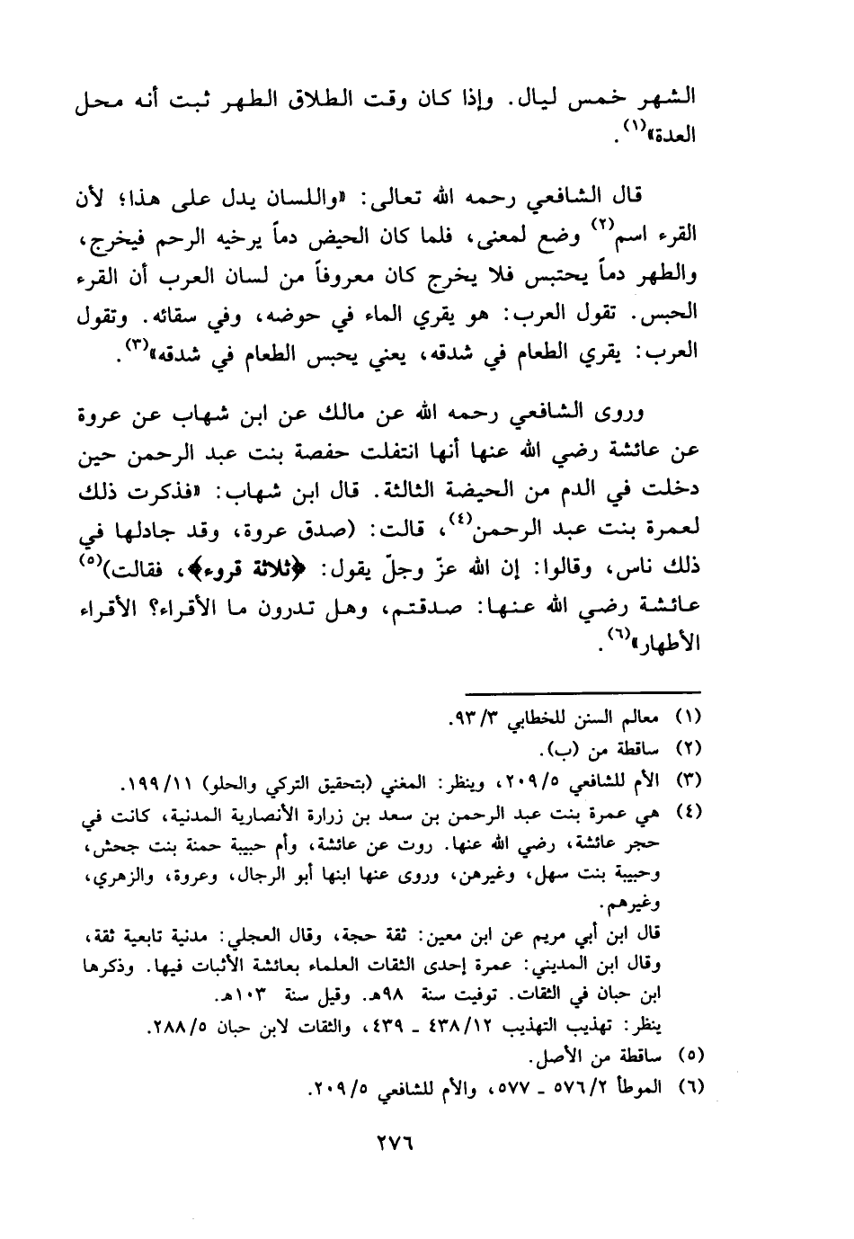 وروى الشَّافِعِي رَحمَه الله عَن مَالك عَن ابْن شهَاب عَن عُرْوَة عَن عَائِشَة رَضِي الله عَنْهَا أَنَّهَا انتفلت حَفْصَة بنت عبد الرَّحْمَن حِين دخلت فِي الدَّم من الْحَيْضَة الثَّالِثَة. قَالَ ابْن شهَاب: " فَذكرت ذَلِك لعمرة بنت عبد الرَّحْمَن، قَالَت: (صدق عُرْوَة، وَقد جادلها فِي ذَلِك نَاس، وَقَالُوا: إِن الله عز وَجل يَقُول: {ثَلَاثَة قُرُوء} ، فَقَالَت) عَائِشَة رَضِي الله عَنْهَا: صَدقْتُمْ، وَهل تَدْرُونَ مَا الْأَقْرَاء؟ الْأَقْرَاء الْأَطْهَار ".