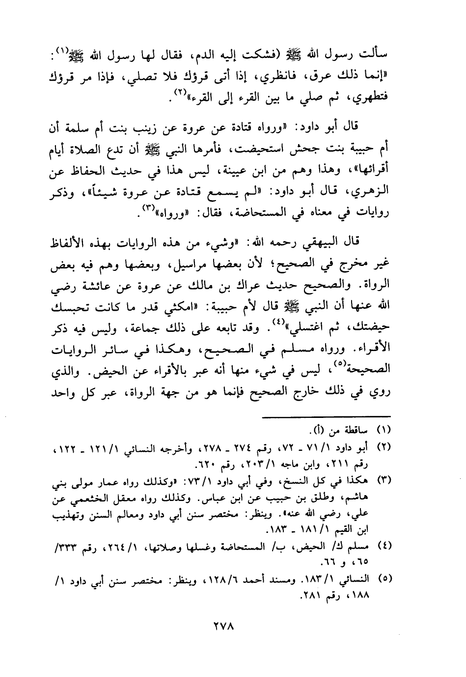 قَالَ الْبَيْهَقِيّ رَحمَه الله: " وَشَيْء من هَذِه الرِّوَايَات بِهَذِهِ الْأَلْفَاظ غير مخرج فِي الصَّحِيح؛ لِأَن بَعْضهَا مَرَاسِيل، وَبَعضهَا وهم فِيهِ بعض الروَاة. وَالصَّحِيح حَدِيث عرَاك بن مَالك عَن عُرْوَة عَن عَائِشَة رَضِي الله عَنْهَا أَن النَّبِي - صَلَّى اللَّهُ عَلَيْهِ وَسَلَّم َ - قَالَ لأم حَبِيبَة: " امكثي قدر مَا كَانَت تحبسك حيضتك، ثمَّ اغْتَسِلِي ". وَقد تَابعه على ذَلِك جمَاعَة، وَلَيْسَ فِيهِ ذكر الْأَقْرَاء. وَرَوَاهُ مُسلم فِي الصَّحِيح، وَهَكَذَا فِي سَائِر الرِّوَايَات الصَّحِيحَة، لَيْسَ فِي شَيْء مِنْهَا أَنه عبر بِالْأَقْرَاءِ عَن الْحيض. وَالَّذِي رُوِيَ فِي ذَلِك خَارج الصَّحِيح فَإِنَّمَا هُوَ من جِهَة الروَاة، عبر كل وَاحِد
