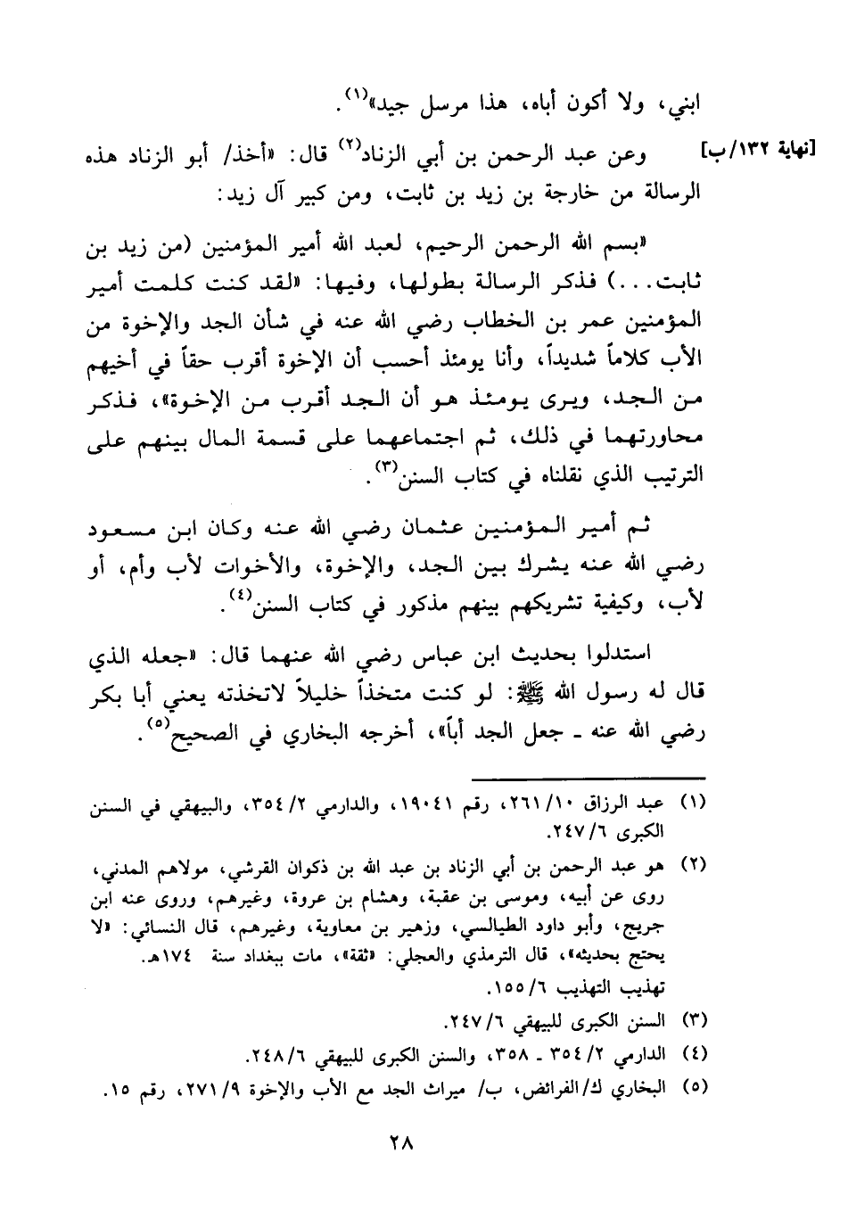 " بِسم الله الرَّحْمَن الرَّحِيم، لعبد الله أَمِير الْمُؤمنِينَ (من زيد بن ثَابت ... .) فَذكر الرسَالَة بِطُولِهَا، وفيهَا: " لقد كنت كلمت أَمِير الْمُؤمنِينَ عمر بن الْخطاب رَضِي الله عَنهُ فِي شَأْن الْجد وَالإِخْوَة من الْأَب كلَاما شَدِيدا، وَأَنا يَوْمئِذٍ أَحسب أَن الْإِخْوَة أقرب حَقًا فِي أخيهم من الْجد، وَيرى يَوْمئِذٍ هُوَ أَن الْجد أقرب من الْإِخْوَة "، فَذكر محاورتهما فِي ذَلِك، ثمَّ اجْتِمَاعهمَا على قسْمَة المَال بَينهم على التَّرْتِيب الَّذِي نَقَلْنَاهُ فِي كتاب السّنَن.
