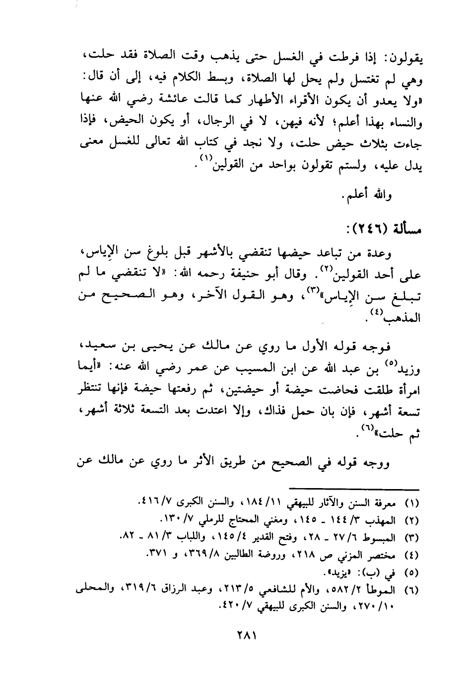 يَقُولُونَ: إِذا فرطت فِي الْغسْل حَتَّى يذهب وَقت الصَّلَاة فقد حلت، وَهِي لم تَغْتَسِل وَلم يحل لَهَا الصَّلَاة، وَبسط الْكَلَام فِيهِ، إِلَى أَن قَالَ: " وَلَا يعدو أَن يكون الْأَقْرَاء الْأَطْهَار كَمَا قَالَت عَائِشَة رَضِي الله عَنْهَا وَالنِّسَاء بِهَذَا أعلم؛ لِأَنَّهُ فِيهِنَّ، لَا فِي الرِّجَال، أَبُو يكون الْحيض، فَإِذا جَاءَت بِثَلَاث حيض حلت، وَلَا نجد فِي كتاب الله تَعَالَى للْغسْل معنى يدل عَلَيْهِ، ولستم تَقولُونَ بِوَاحِد من الْقَوْلَيْنِ.